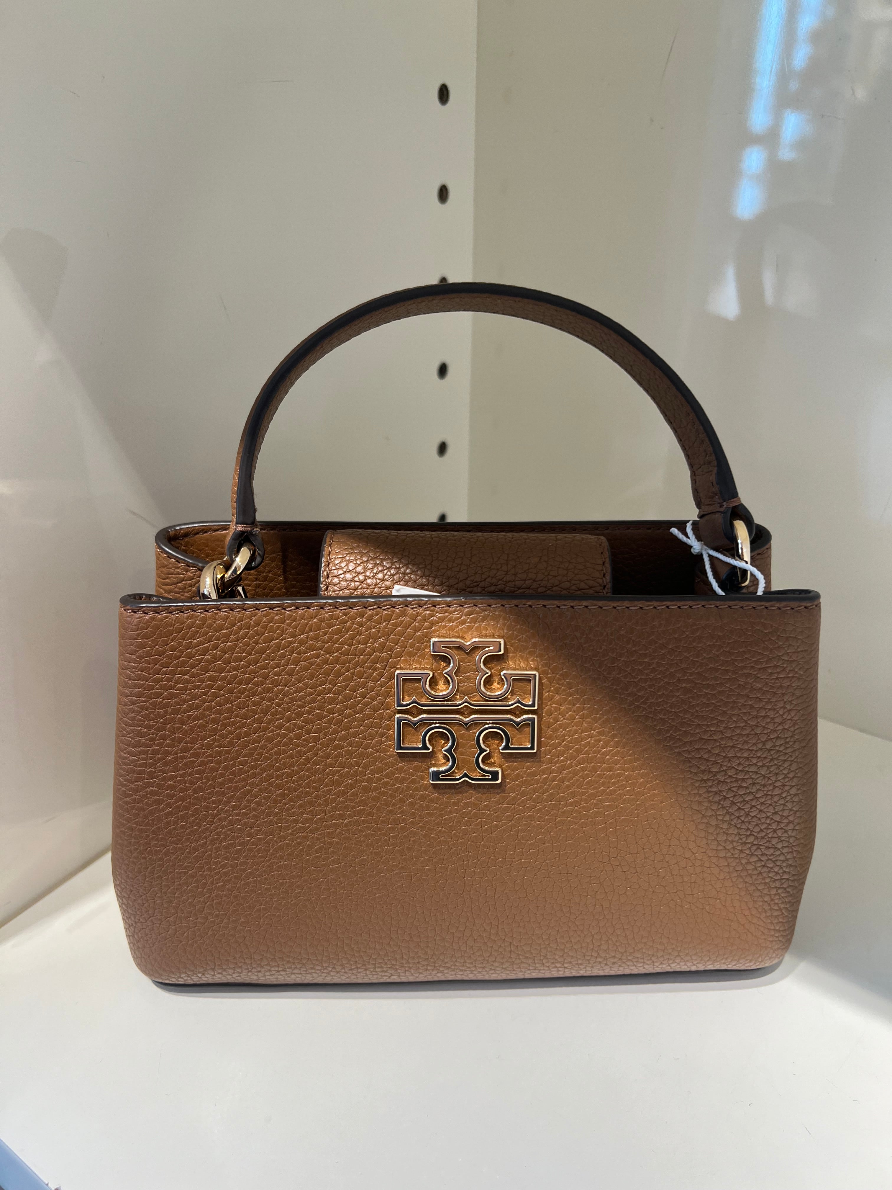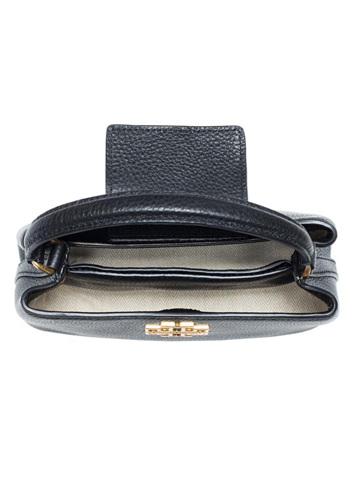 • Crafted from pebbled leather with fabric lining interior. It features an open button magnetic snap closure, old english brass tone hardware, 2 slip pockets, and adjustable or removable crossbody wear.