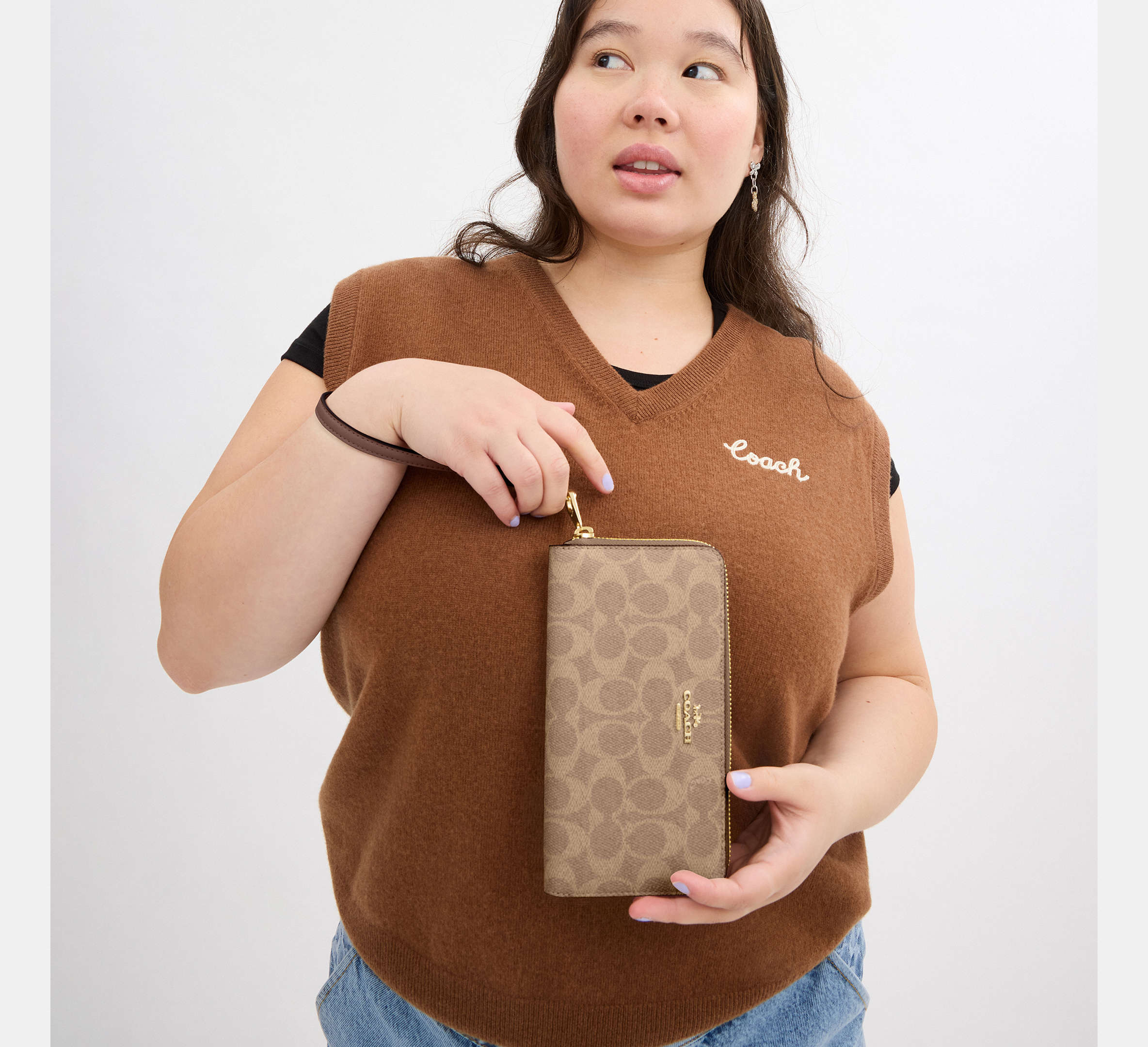Coach Long Zip Around Wallet In Signature - Gold/Tan/Brown
