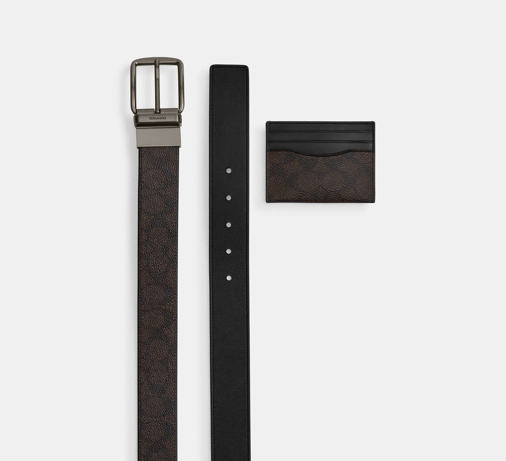 Coach Boxed Card Case And Belt Set In Signature - Gunmetal/Walnut/Black