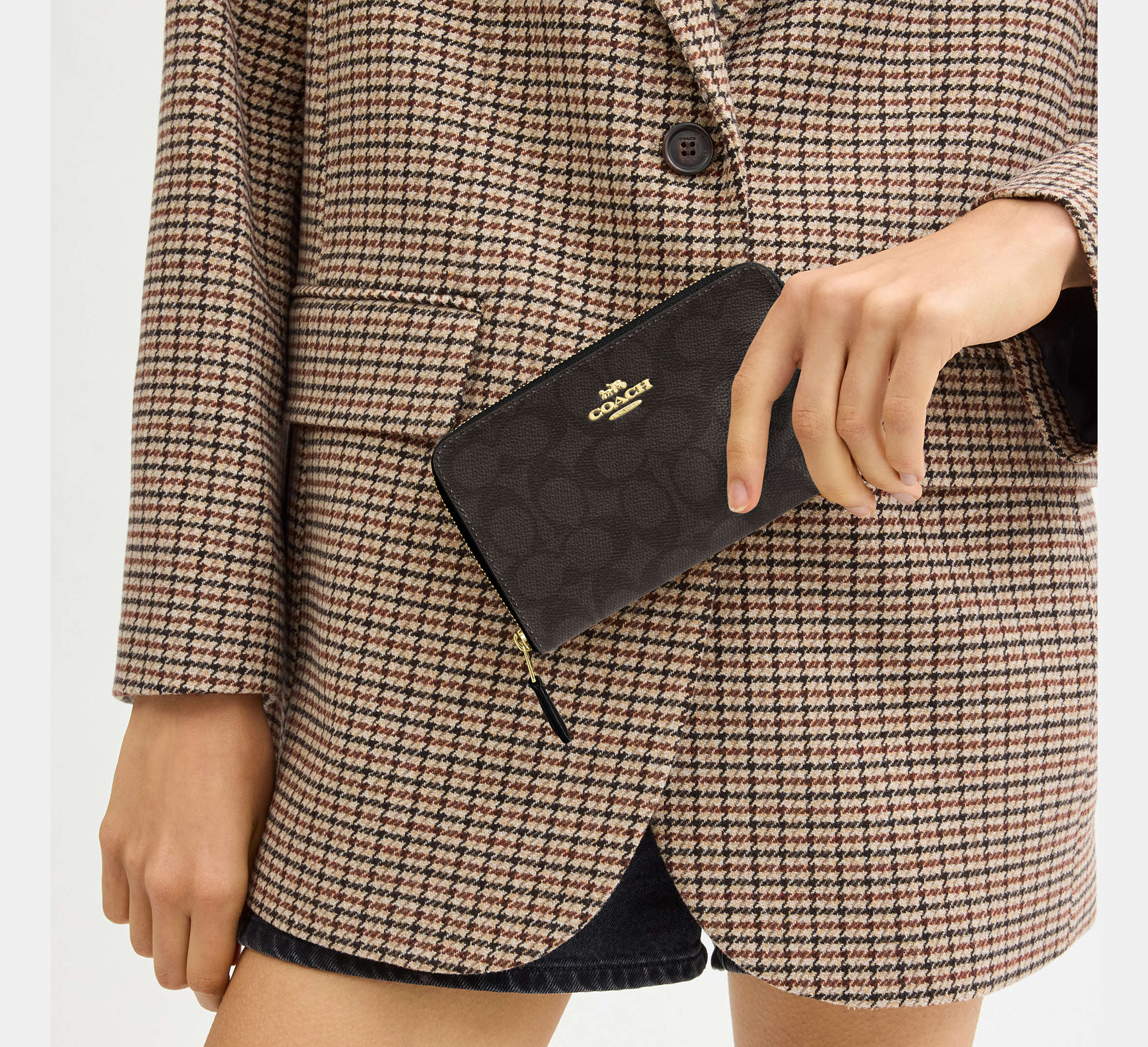 Coach Medium Id Zip Wallet In Signature - Gold/Walnut/Black