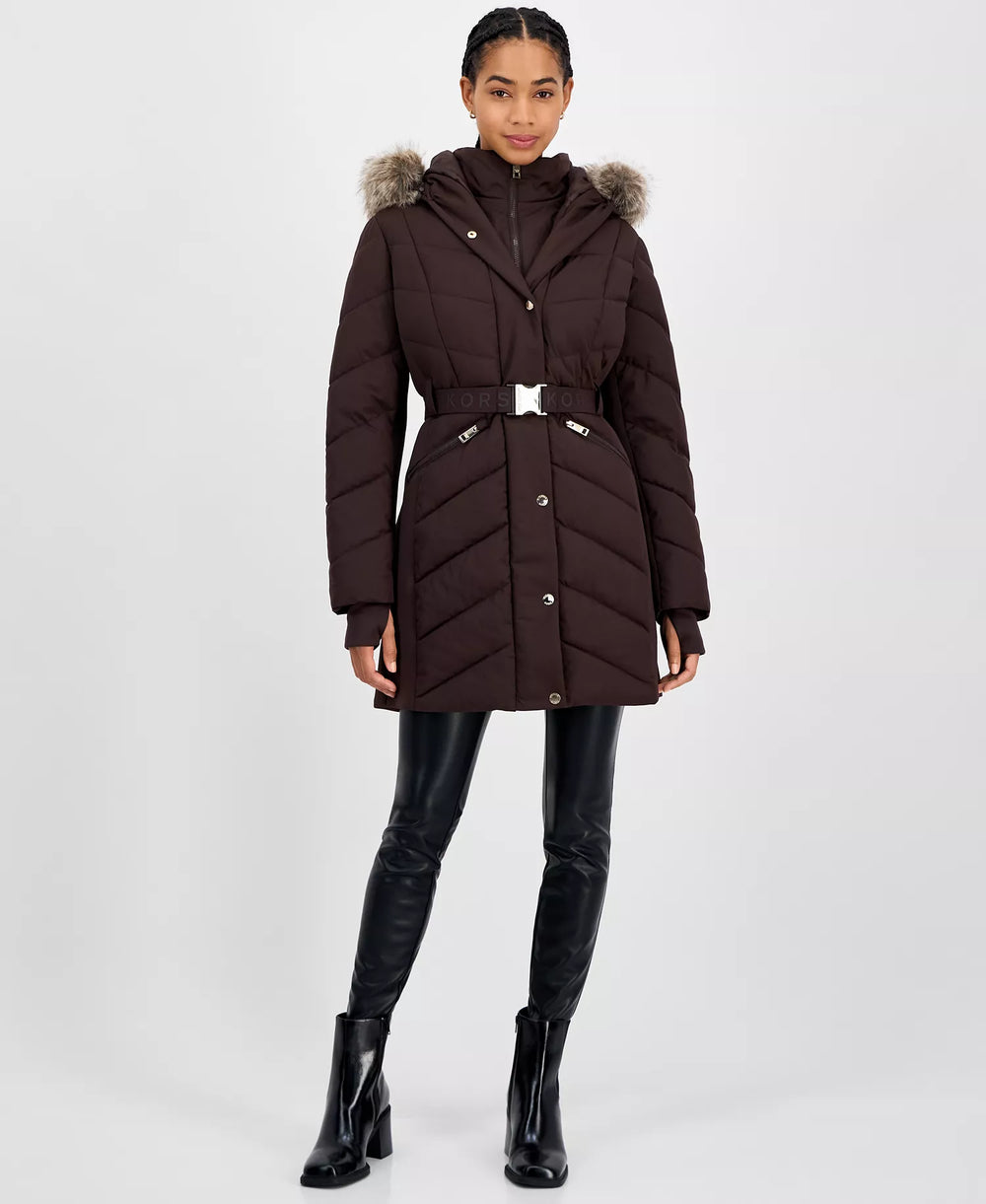 Michael Kors Women's Faux-Fur-Trim Hooded Belted Puffer Coat-Chocolate