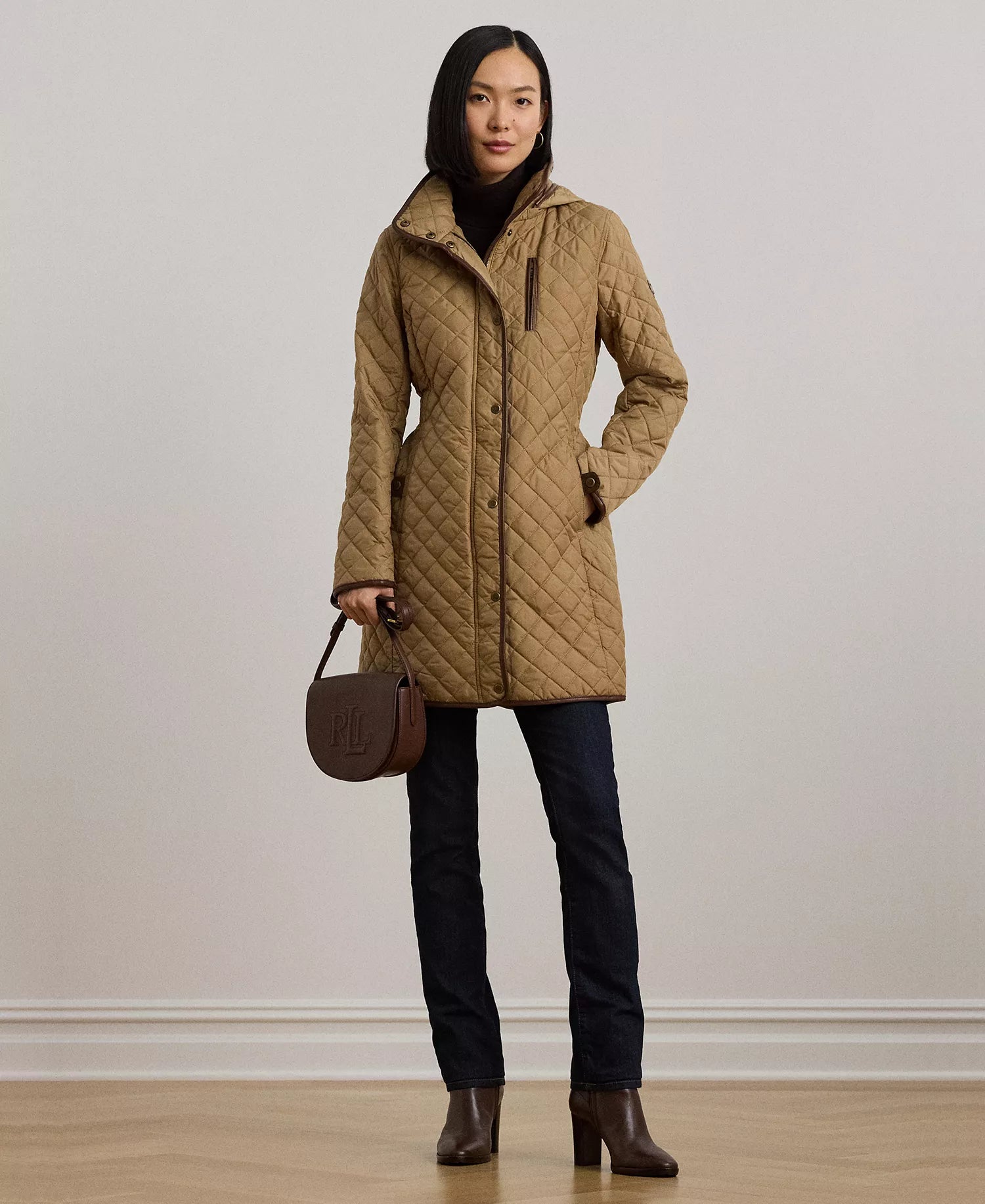 Balıksırtı deseni ve elmas şeklindeki kapitone dikişler, bu Lauren Ralph Lauren montuna derinlik ve sofistike bir tarz kazandırıyor. Çıkarılabilir kapüşonu ve yalıtımlı yapısı sayesinde sıcak tutacak şekilde tasarlanmıştır. Lüks bir görünüm için suni deri detaylar ve "LRL" kabartmalı çıtçıtlar tasarımı tamamlar.