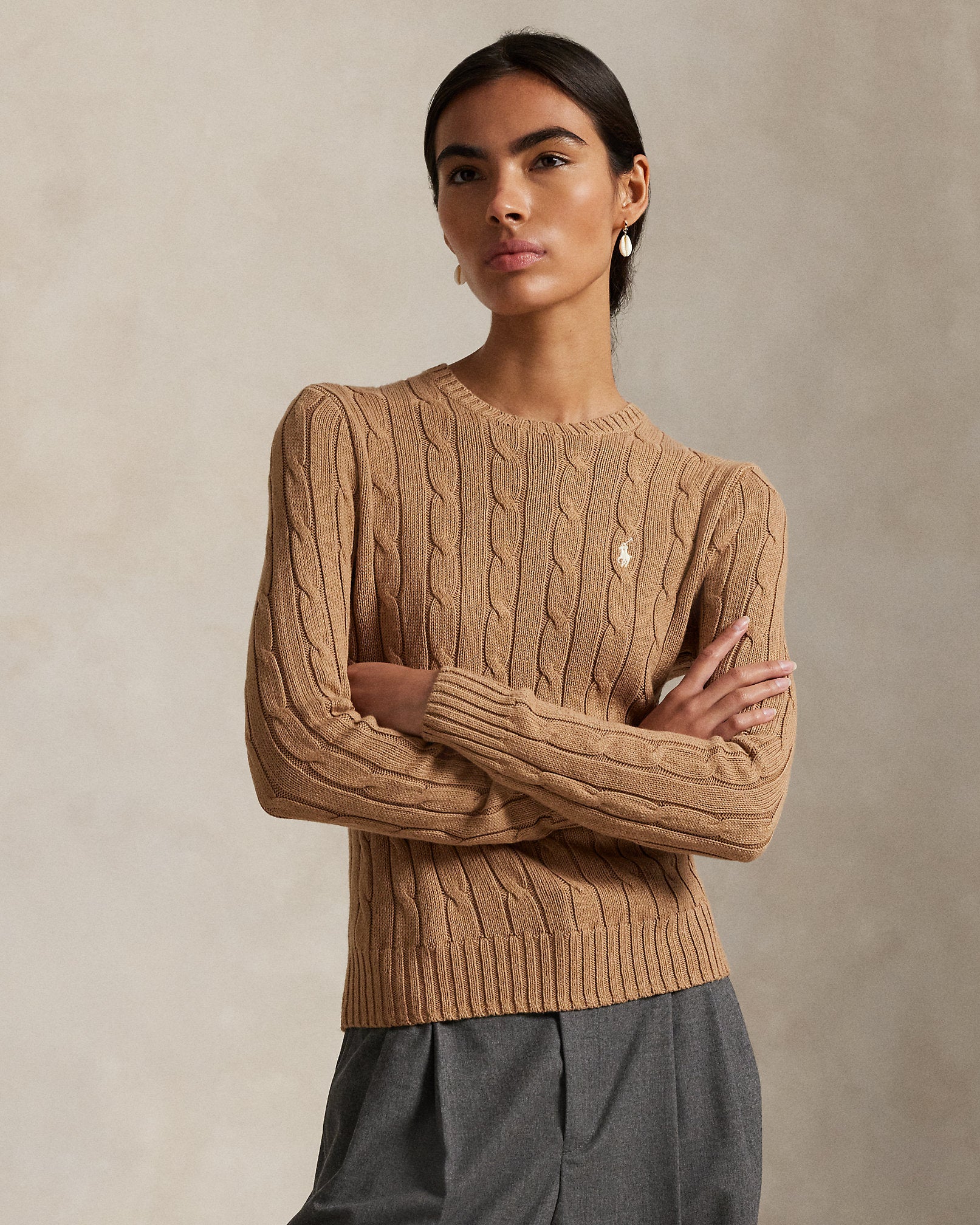 Ralph Lauren Cable-Knit Cotton Crewneck Sweater- Camel Melange