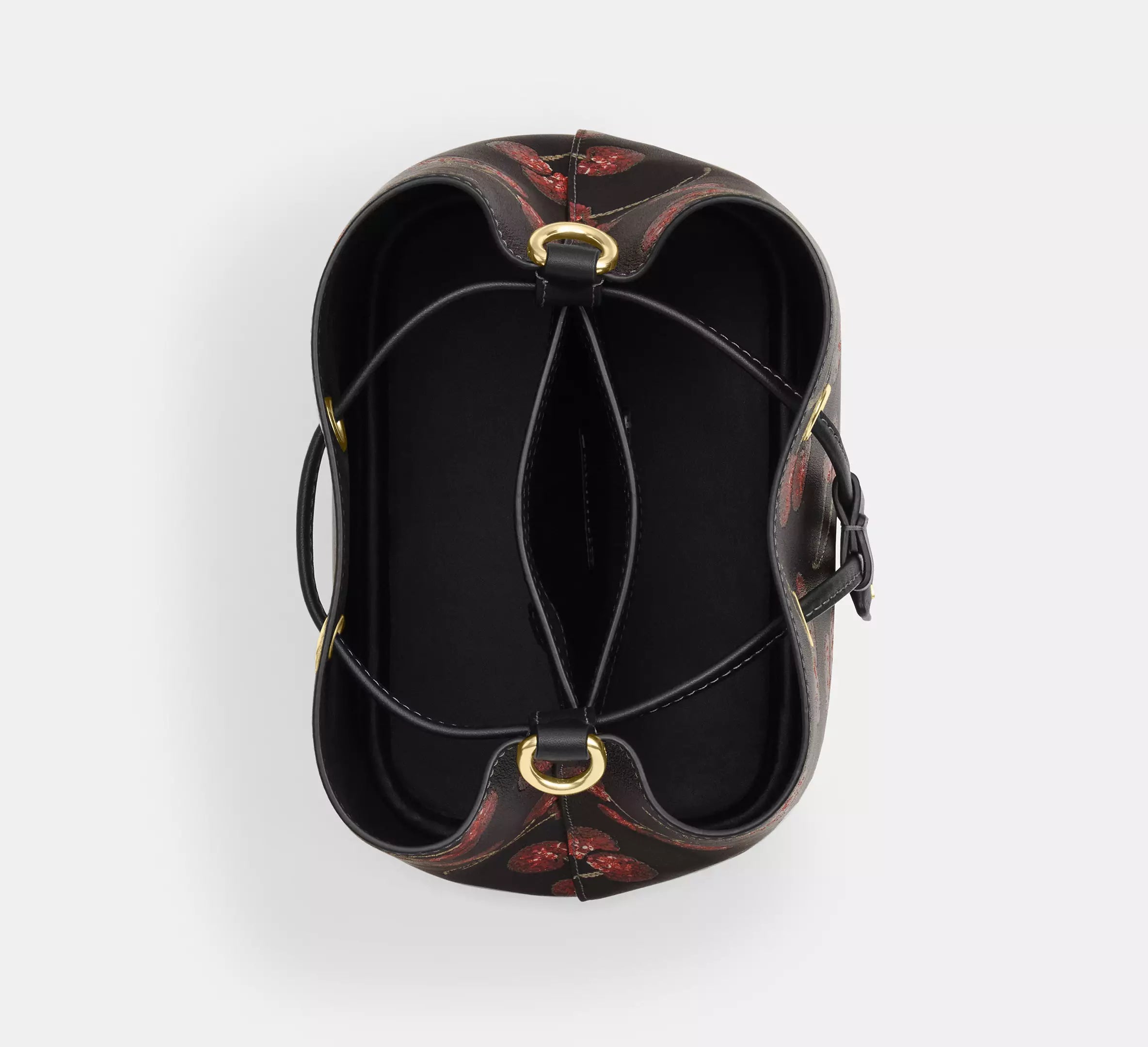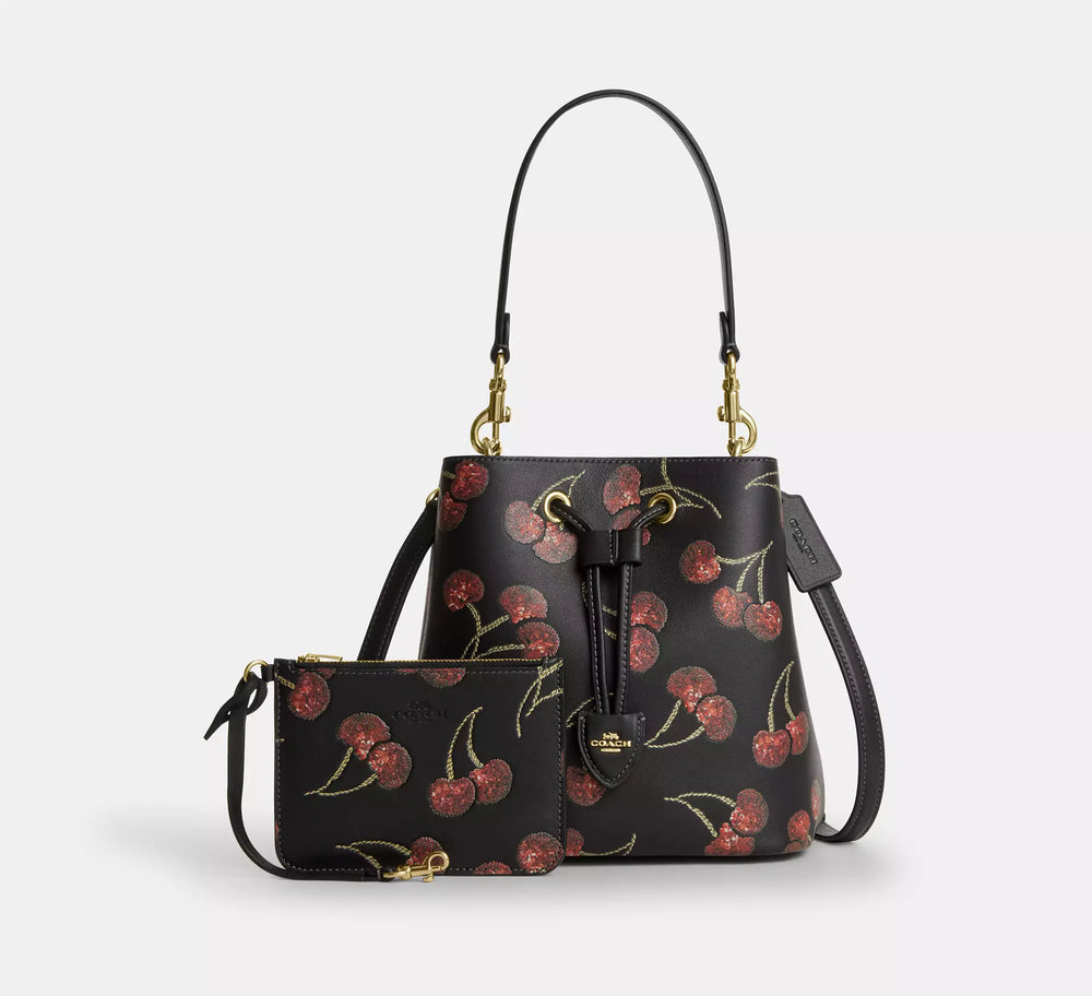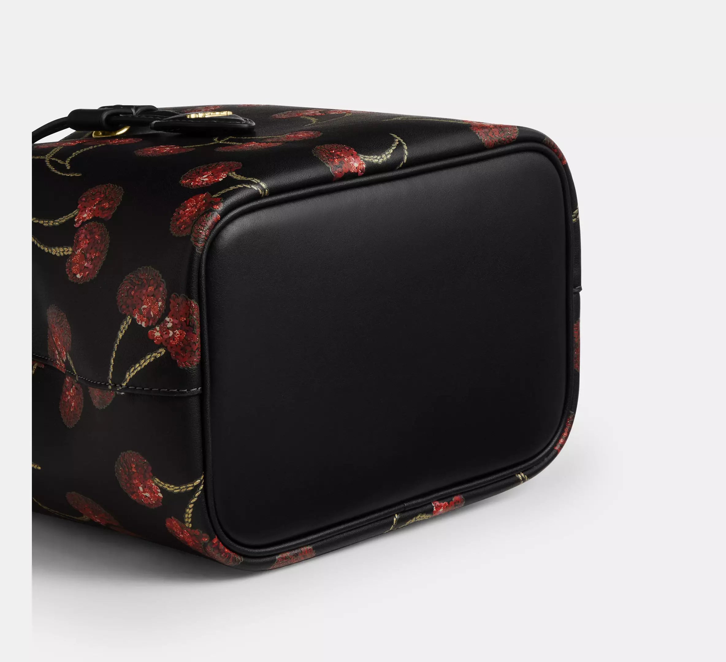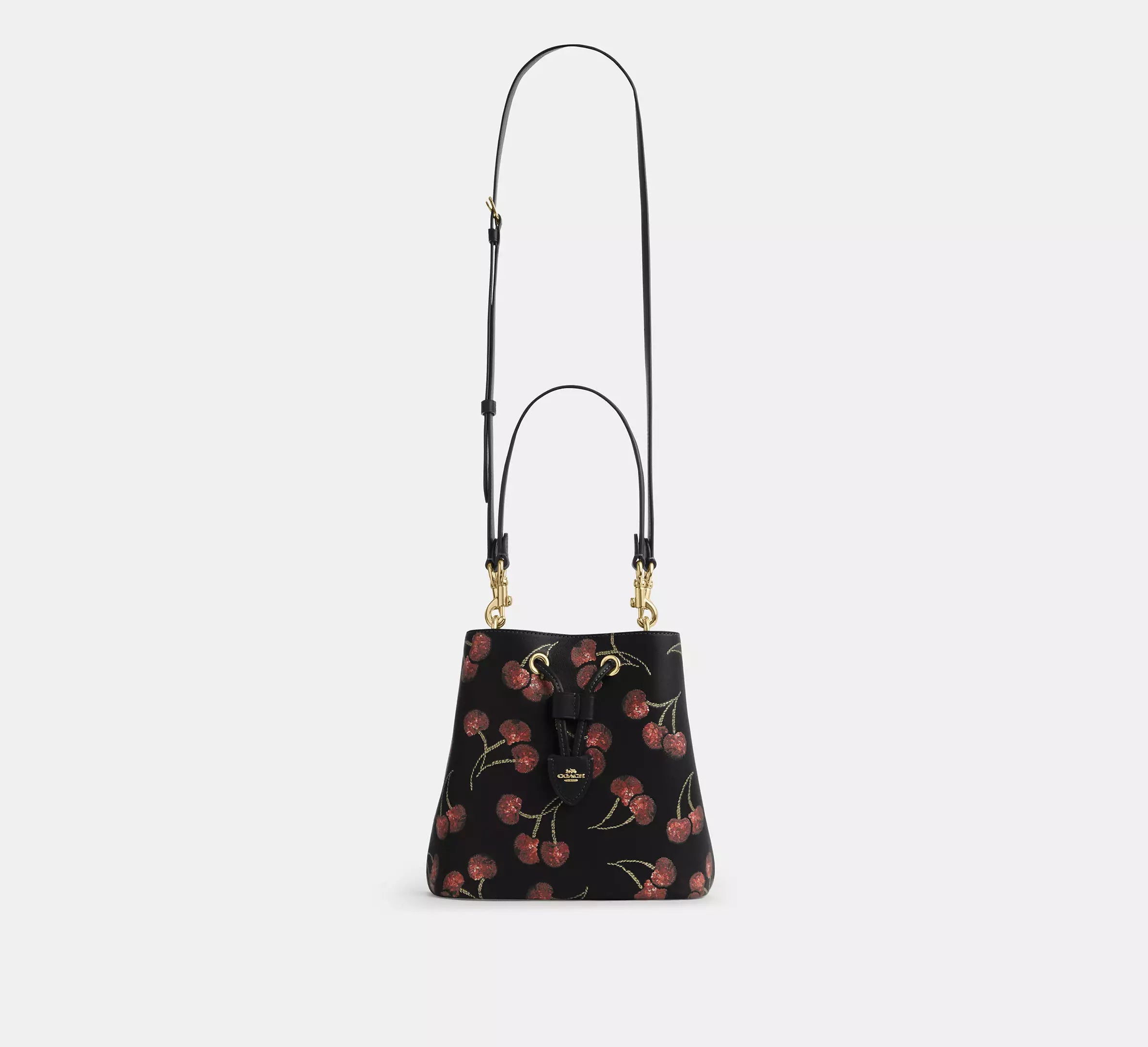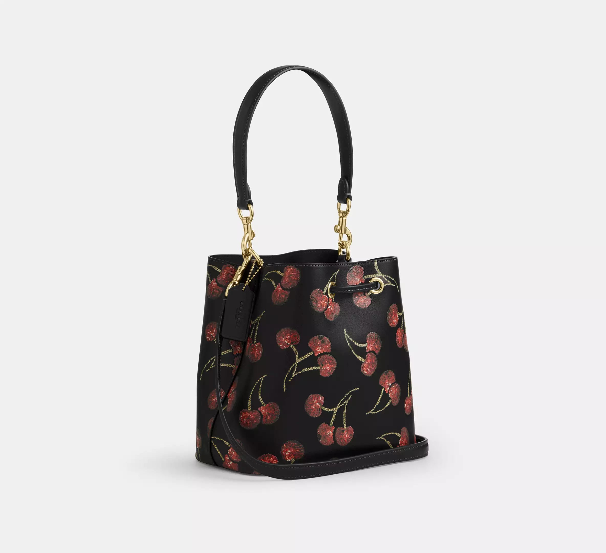 Coach Rowan Bucket Bag With Cherry Print - Gold/Black Multi