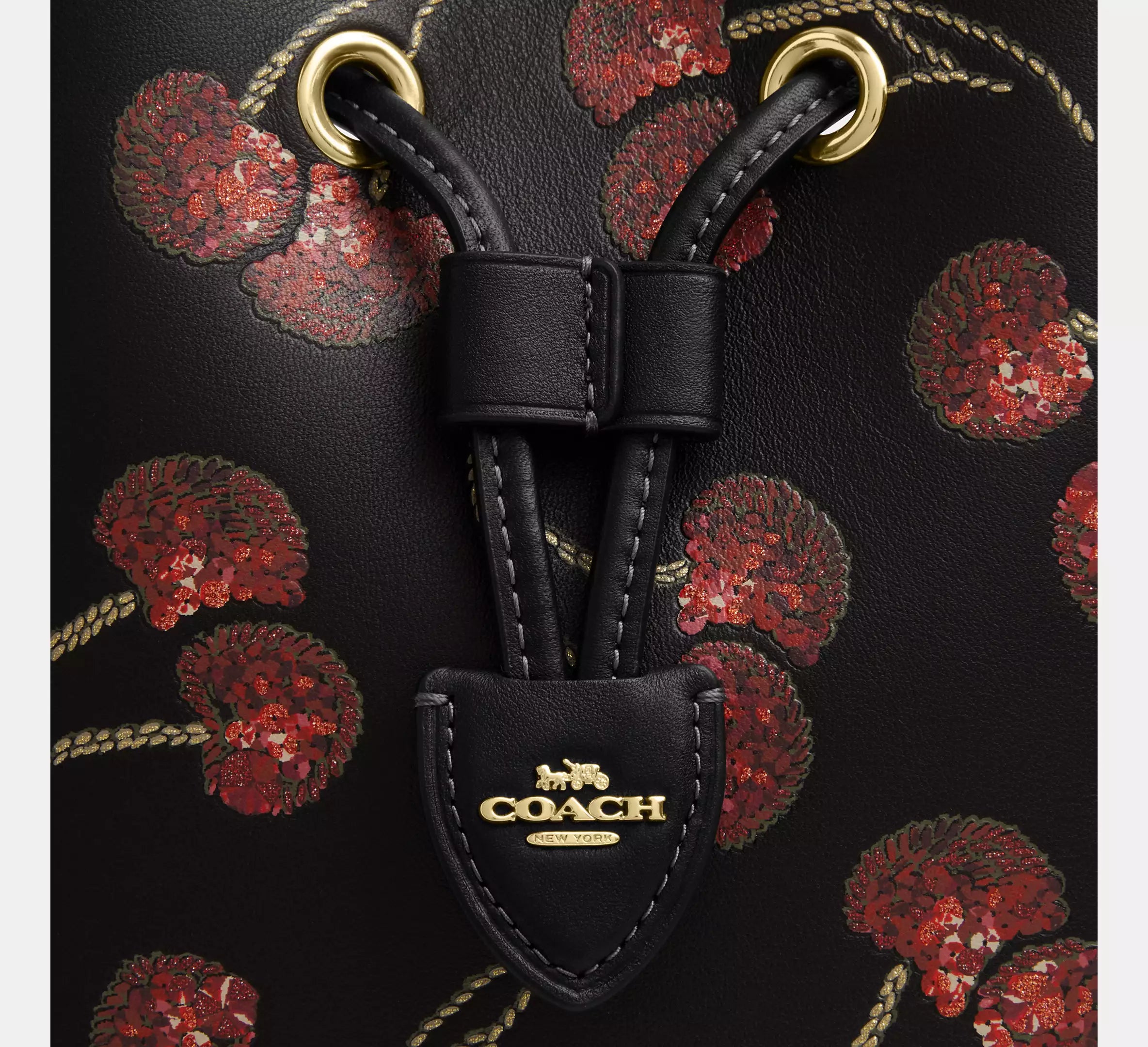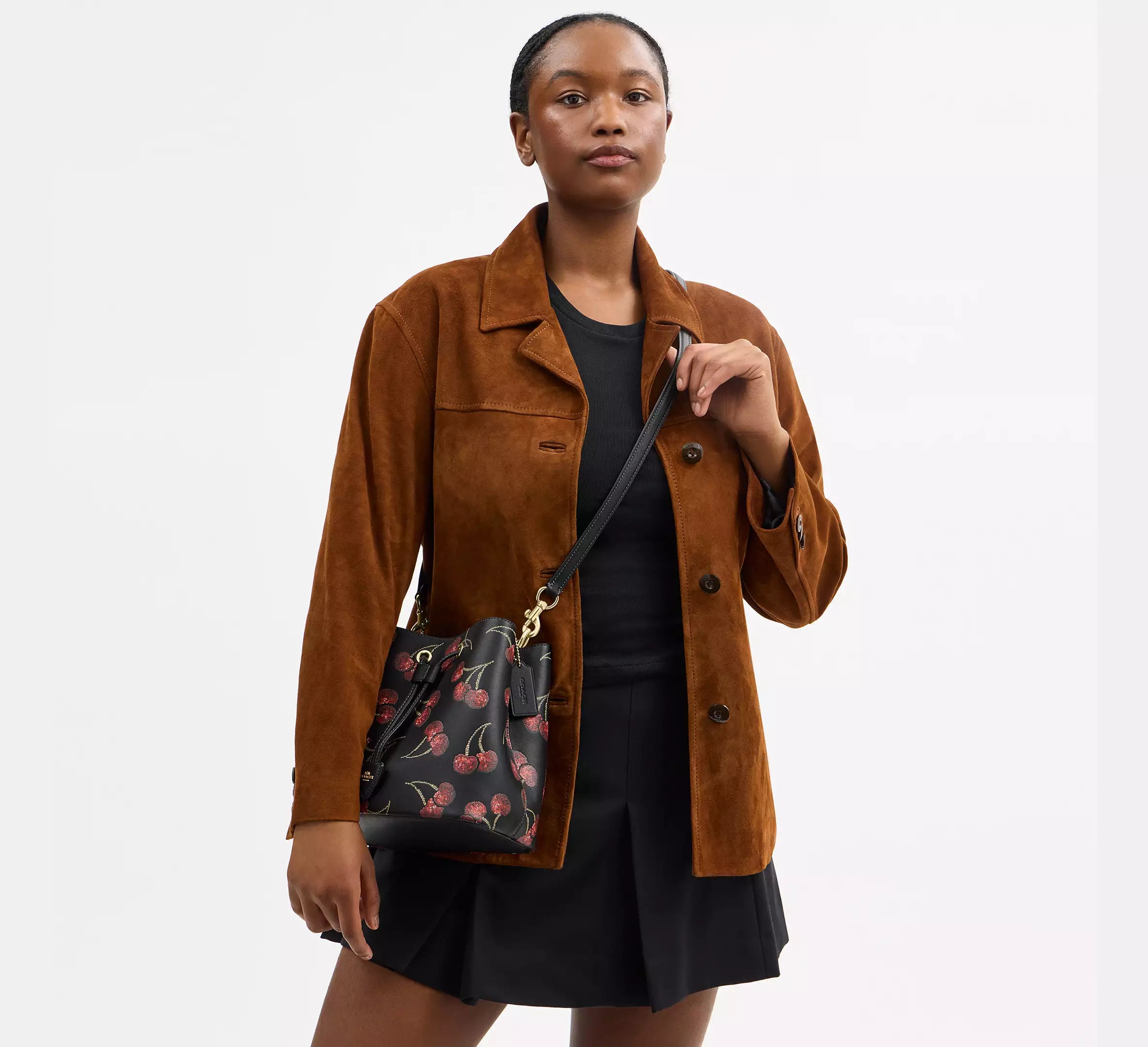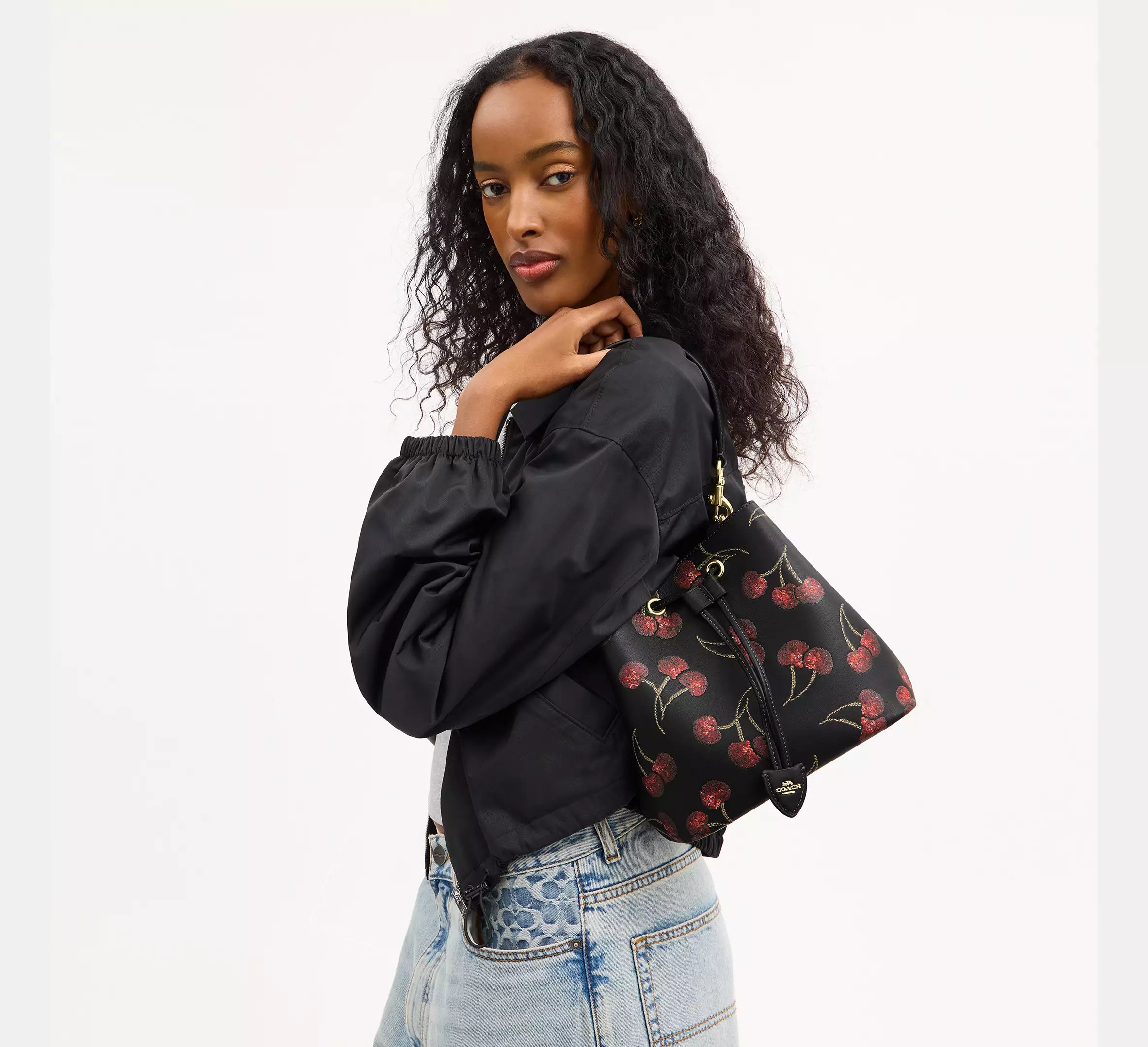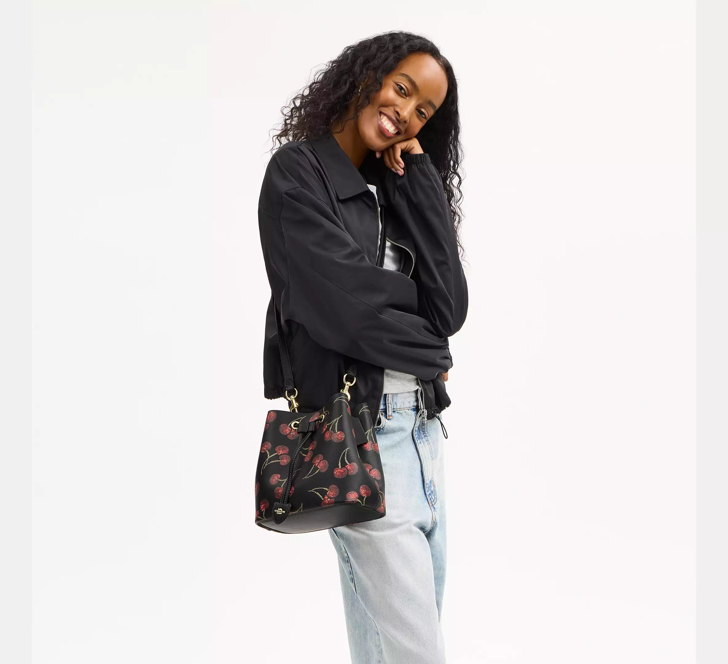 Coach Rowan Bucket Bag With Cherry Print - Gold/Black Multi