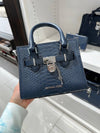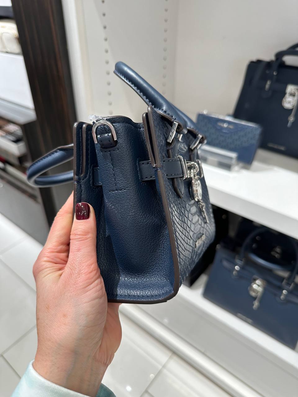 Made of coated canvas. The bag features a zip closure that opens to polyester lining with three card slots, adjustable and removable strap, Double handle drop 10 cm.
