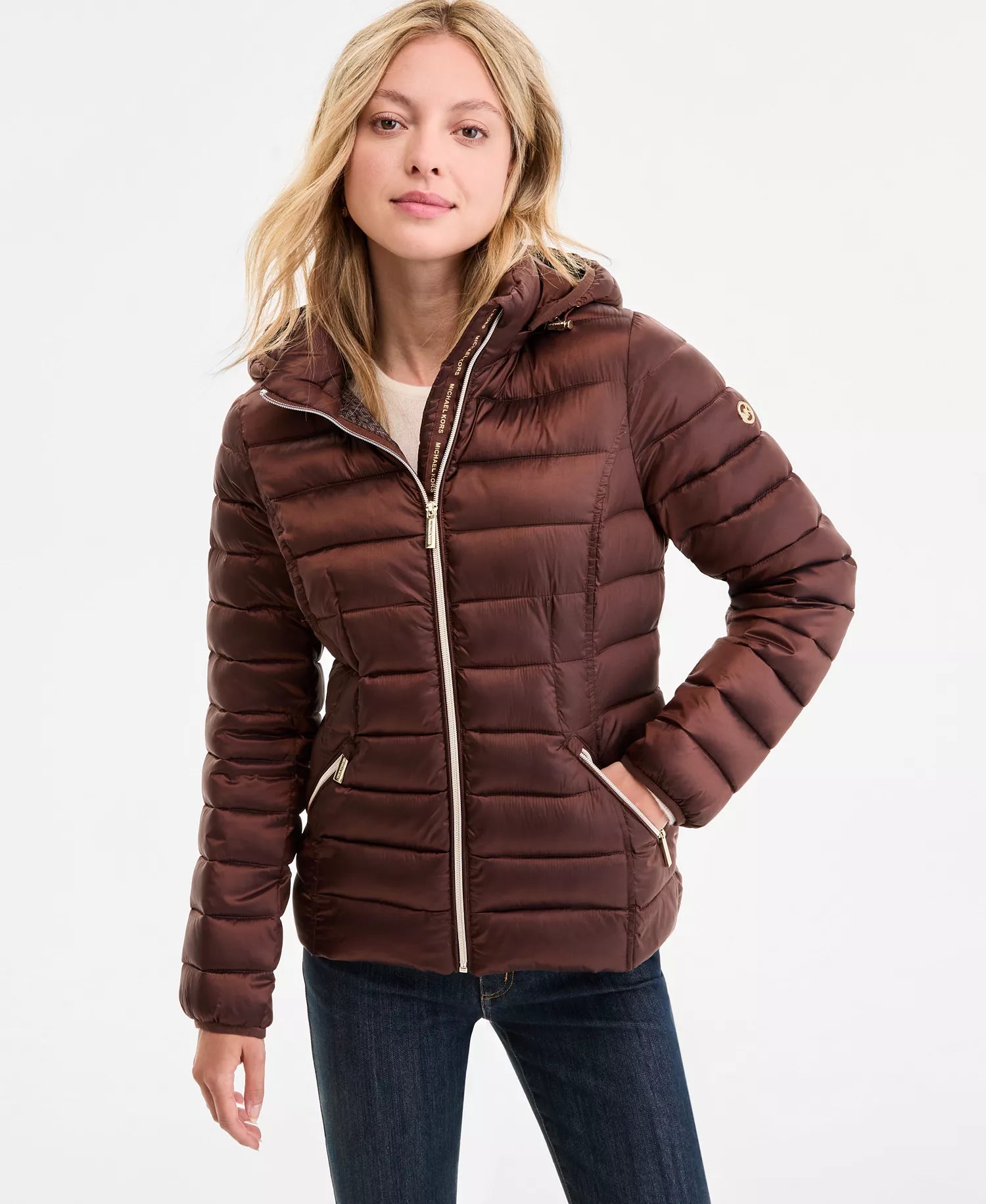 Michael Kors Women's Hooded Shine Packable Puffer Coat-Dk Caramel