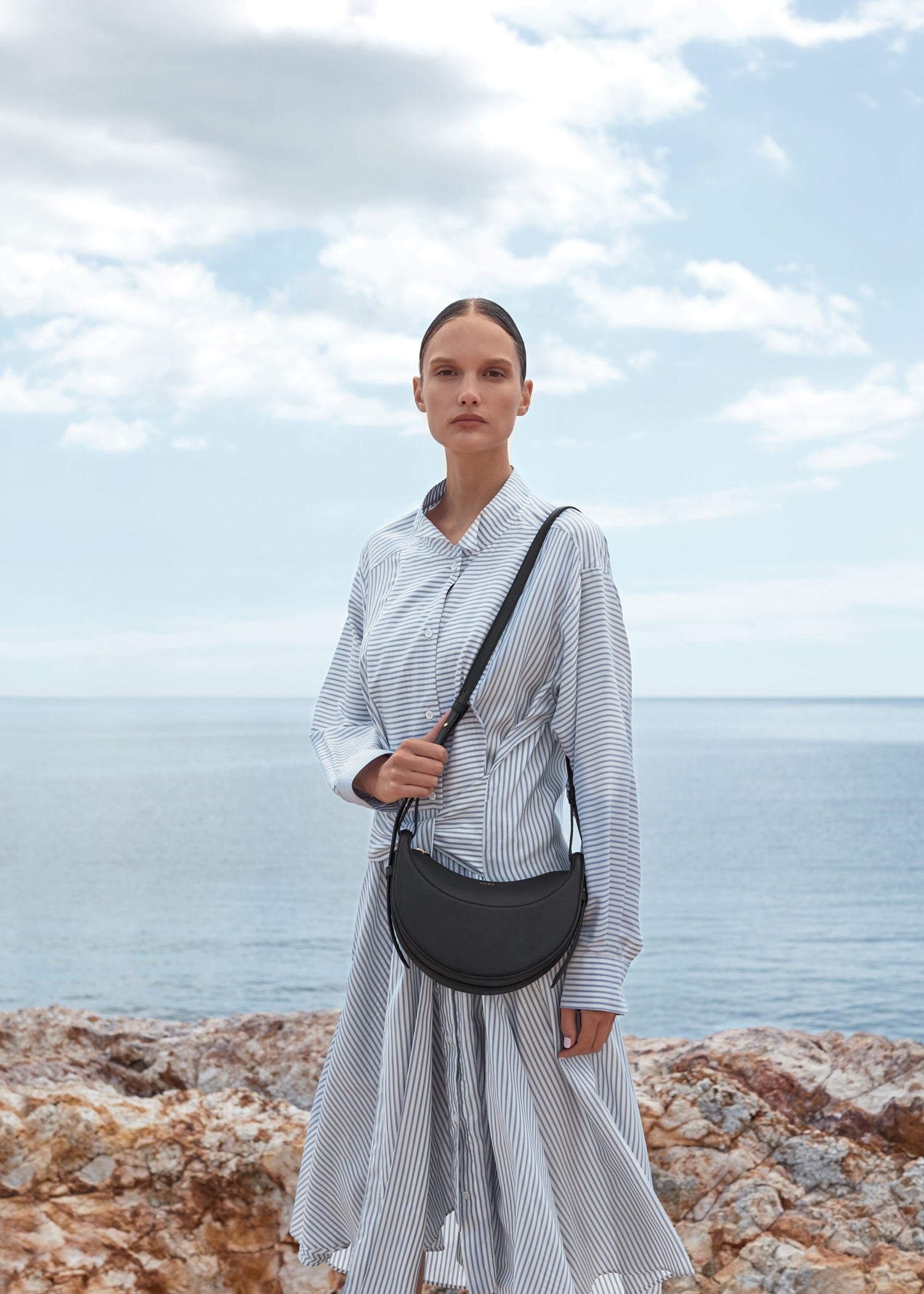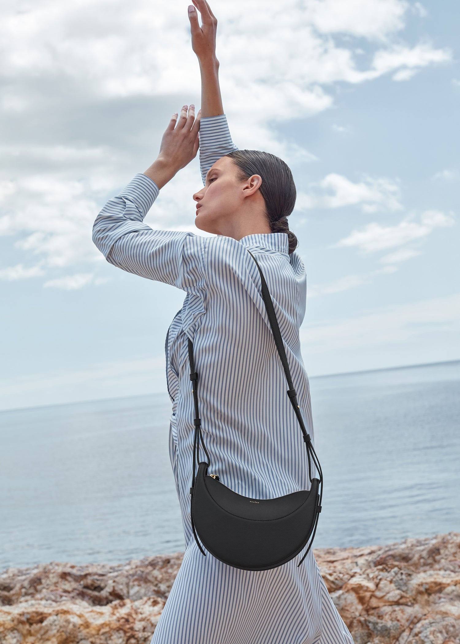 With its rounded shape, foam padding, and hand-stitching, the “Numéro Dix” is a nod to the equestrian codes of saddlery. Its half-moon design highlights juxtaposing curves.