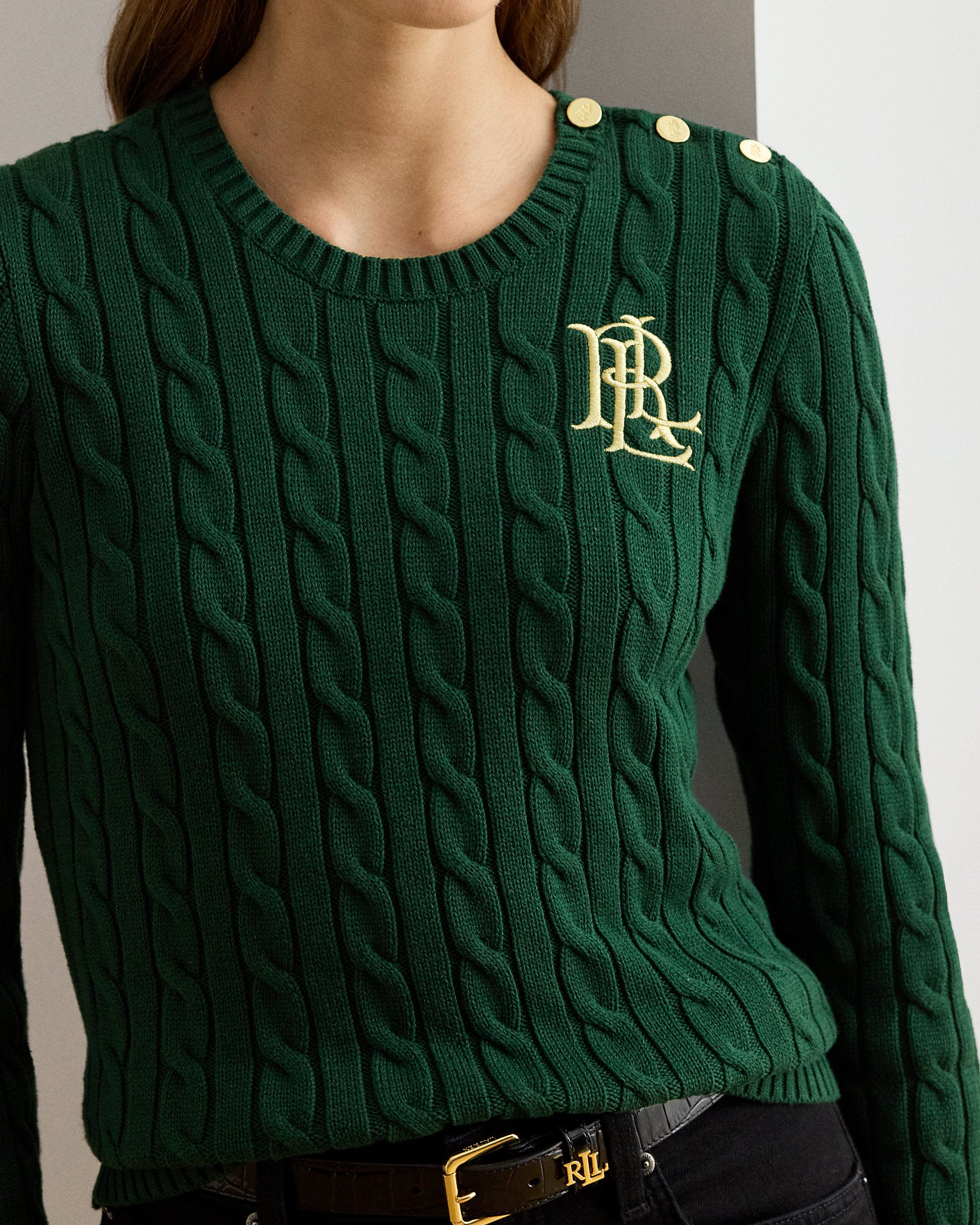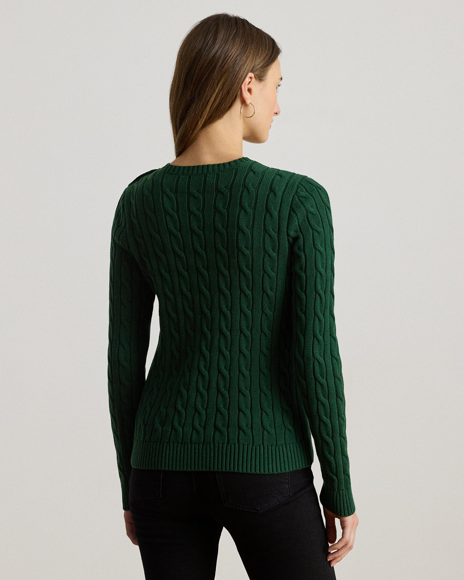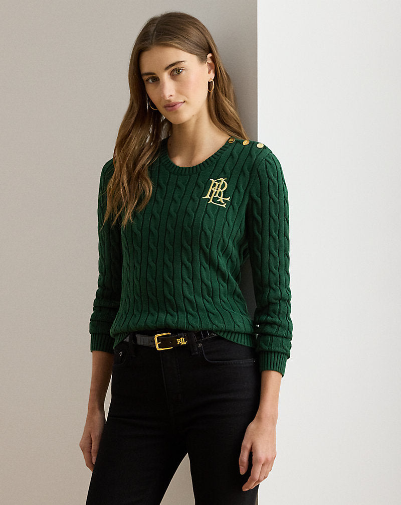 Ralp Lauren Button-Trim Cable-Knit Cotton Sweater- Deep Pine
