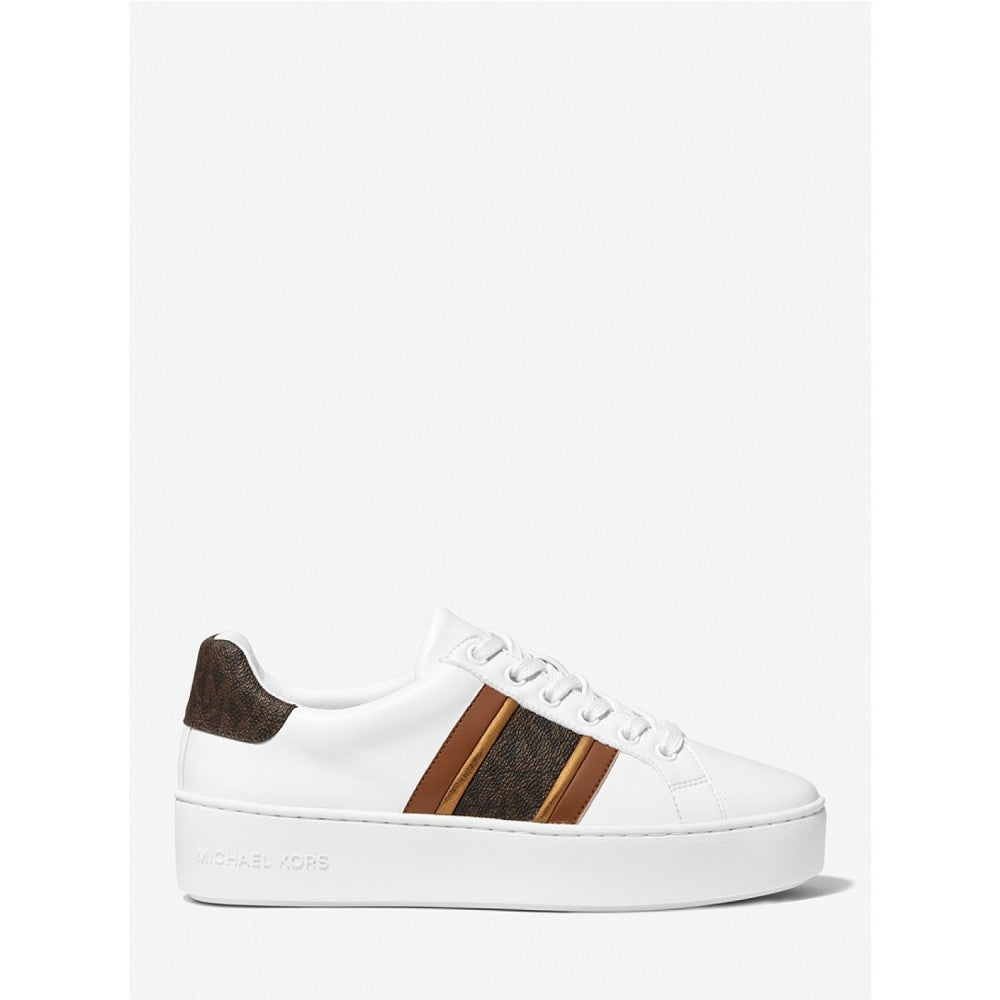 Düz ve yumuşak dokulu suni deri, Michael Kors imza desenli kanvas ve metalik detaylarla tasarlanan bu çizgili spor ayakkabı, gardırobunuza zarif bir dokunuş katar.