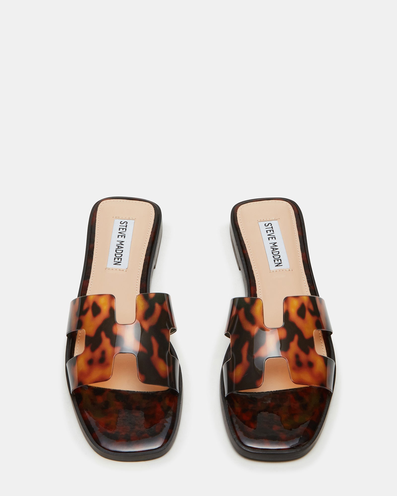 Geniş tek bant üzerindeki geometrik kesikler, bu düz sandalet tasarımına modern ve taze bir hava katıyor.