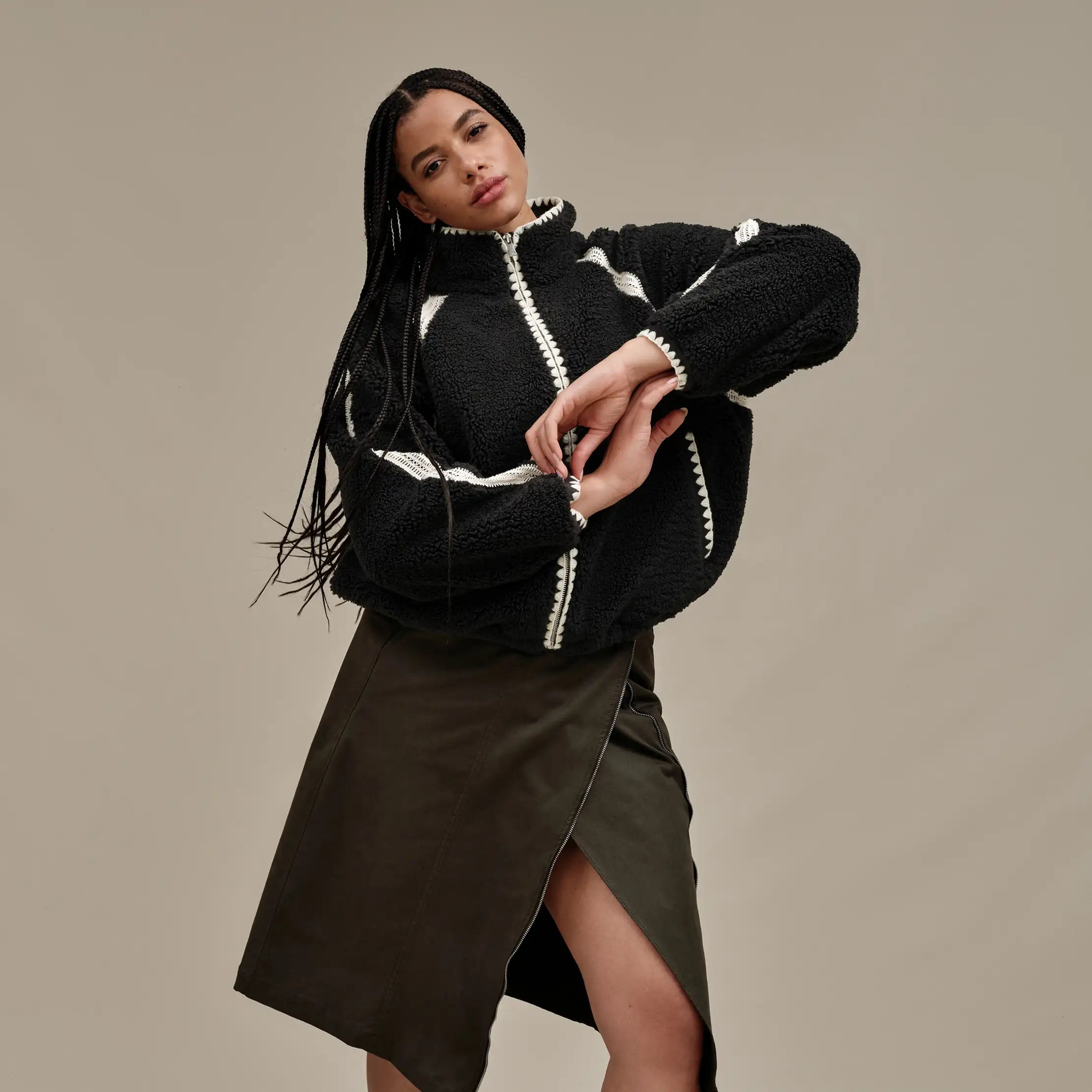 Nikia Crochet UGGfluff Ceket, bir vintage mağazasında bulmayı hayal ettiğiniz sihirli dış giyim parçası—ama önce bizim onu yaratmamız gerekti. Dalgalı (scalloped) kenar süsleri, içe yerleştirilmiş kroşe panelleri ve rahat, bol kesimi gibi miras detaylarıyla tasarlanan bu geri dönüştürülmüş peluş polar ceket, kişiliğinizin bir parçası olmaya hazırlanıyor.