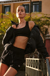 Ya da vücuda oturan, hafif kısa kesimi ve ayarlanabilir büzgü ipleri (bungee detayları).