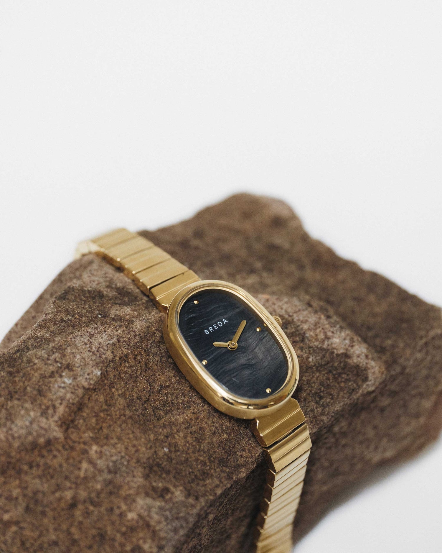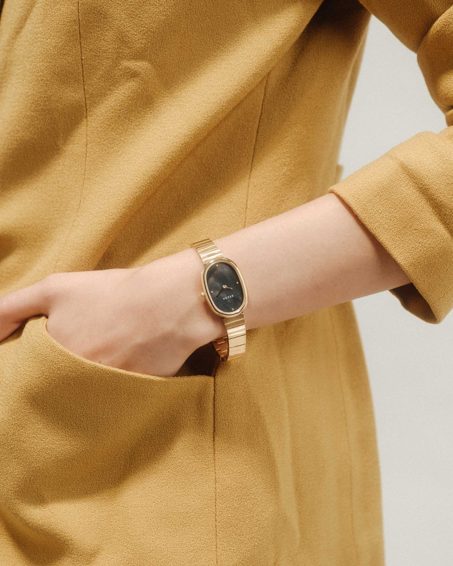 Güneşte su kenarında geçirilen günlerin ve ardından gelen keyifli akşamların ilhamıyla tasarlandı. Jane, zarif 23 mm oval kasa, gece yarısı siyahı inci kadran ve altın kaplama paslanmaz çelik bilezikle donatılmıştır. Bilezik, mücevherli bir toka ile kapanır. Zahmetsizce şık ve klasik bir tarz.