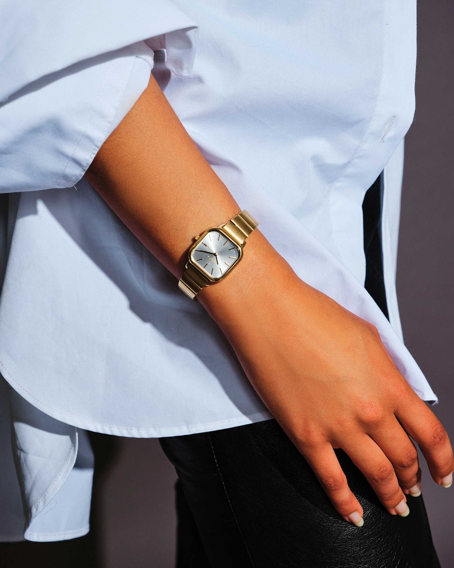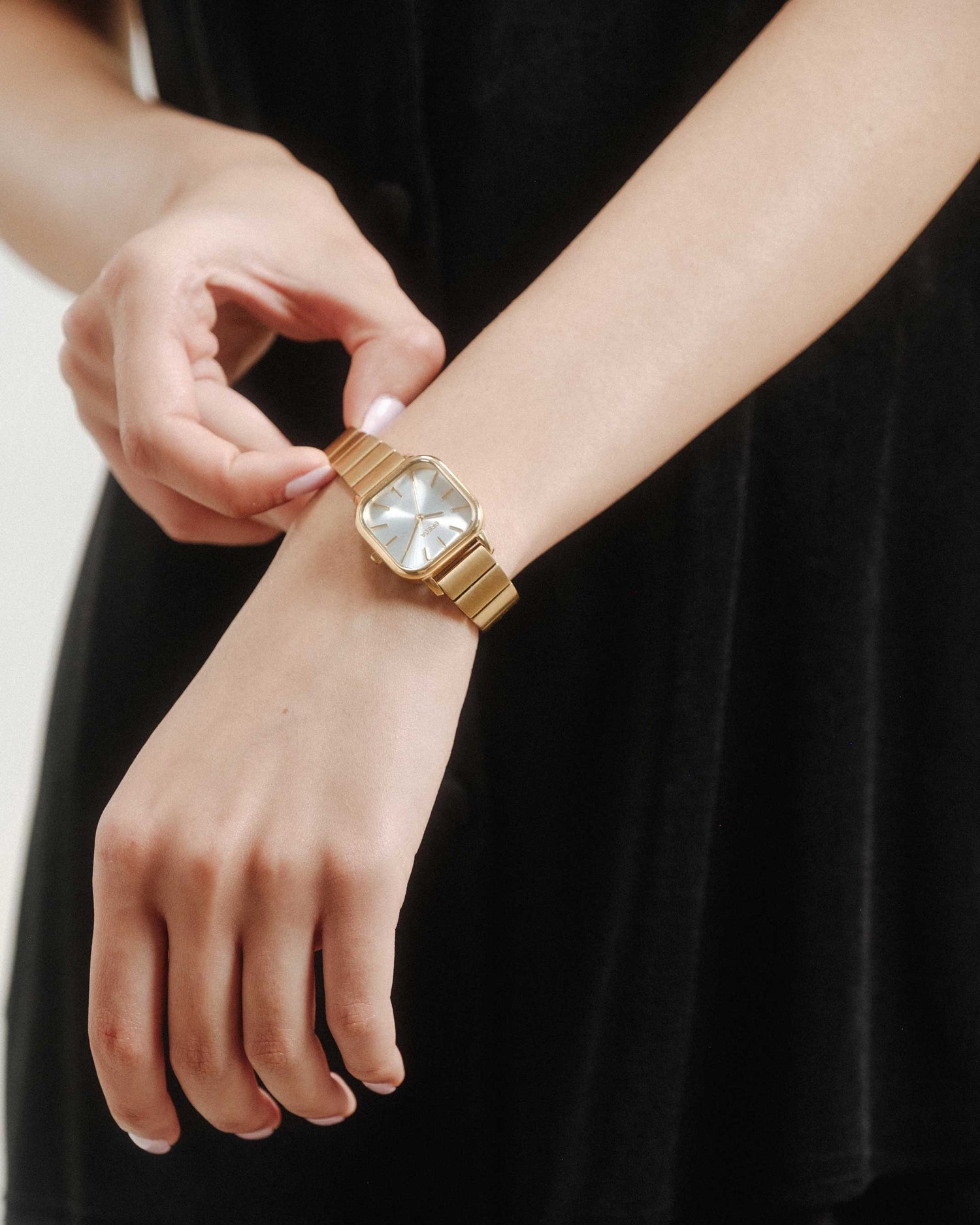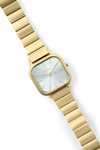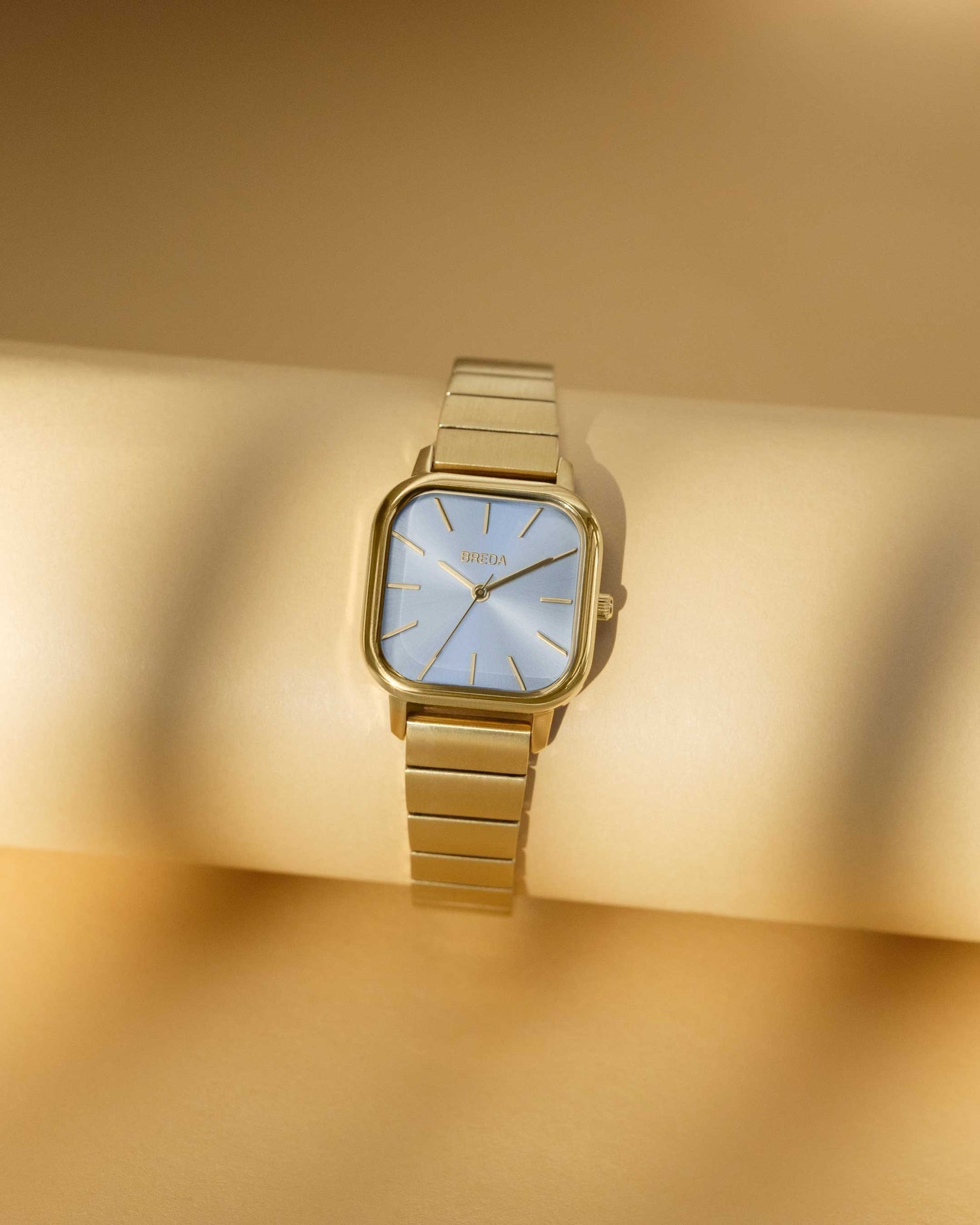 Farklı ve klasik bir stile modern bir yaklaşım. Esther, cesur 26 mm kare kasa, güneş ışığına benzer sisli mavi fırçalanmış kadran ve altın kaplama paslanmaz çelik bilezik ile donatılmıştır. Hem özel günlere hem de trendlere meydan okuyan bir tarz, zamansız bir tasarım anlayışıyla yaratılmıştır.