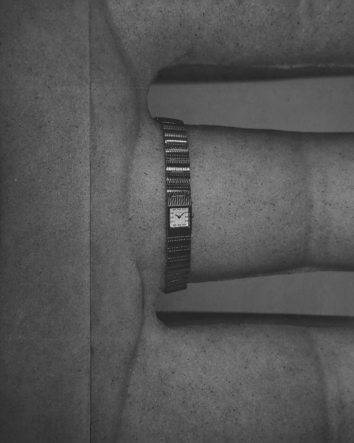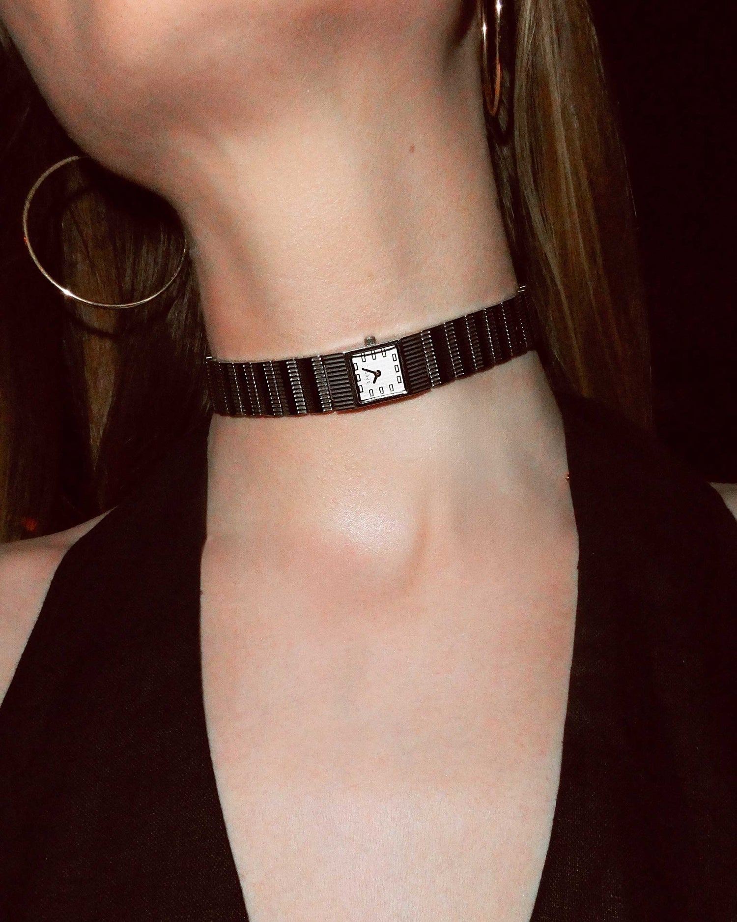 Groove (Time Choker) Time Choker, 16 mm kare kasa ve karmaşık oluklarla işlenmiş 16 mm bilezik, zarif bir toka ve mücevherli bir toka ile dikkat çekiyor. 13.5 inç ve 15 inç boyutlarında mevcut.
