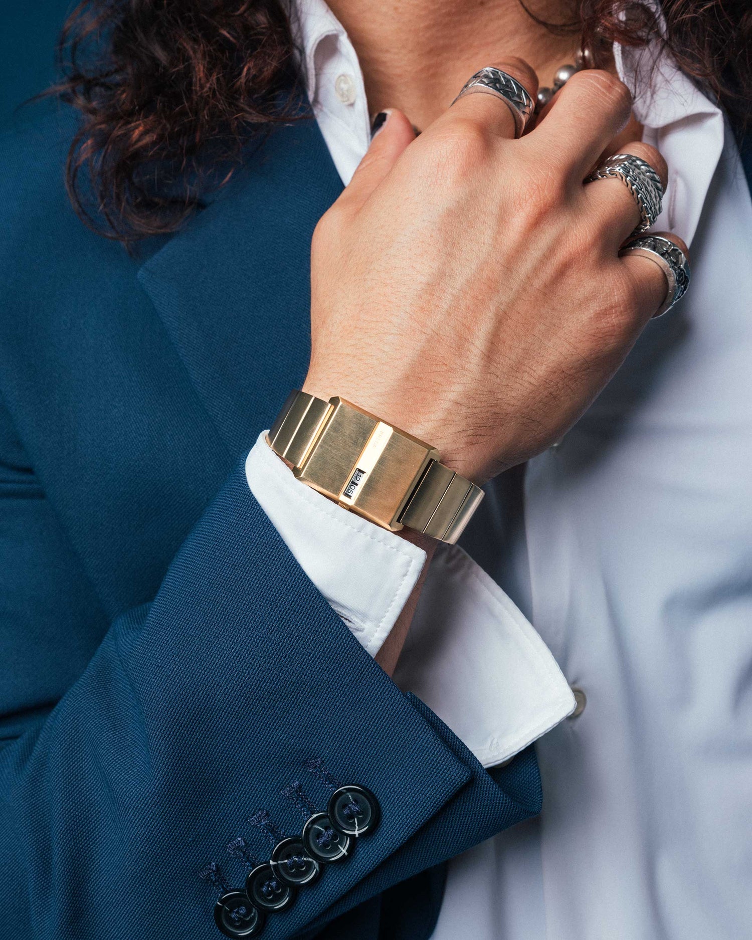 Zarif tanımlayıcı özelliklerle donatılmış olan Pulse, ince 26mm 18 ayar altın kaplama paslanmaz çelik dikdörtgen kasa, şık kenarları ve daralan bilezik tasarımıyla öne çıkıyor ve pusher kapanış mekanizması ile güvenli bir şekilde kapanıyor.