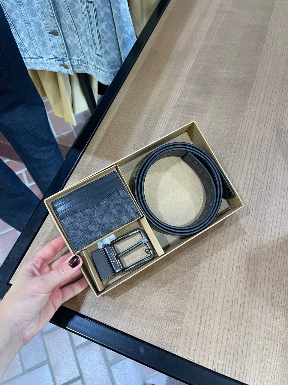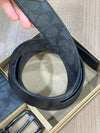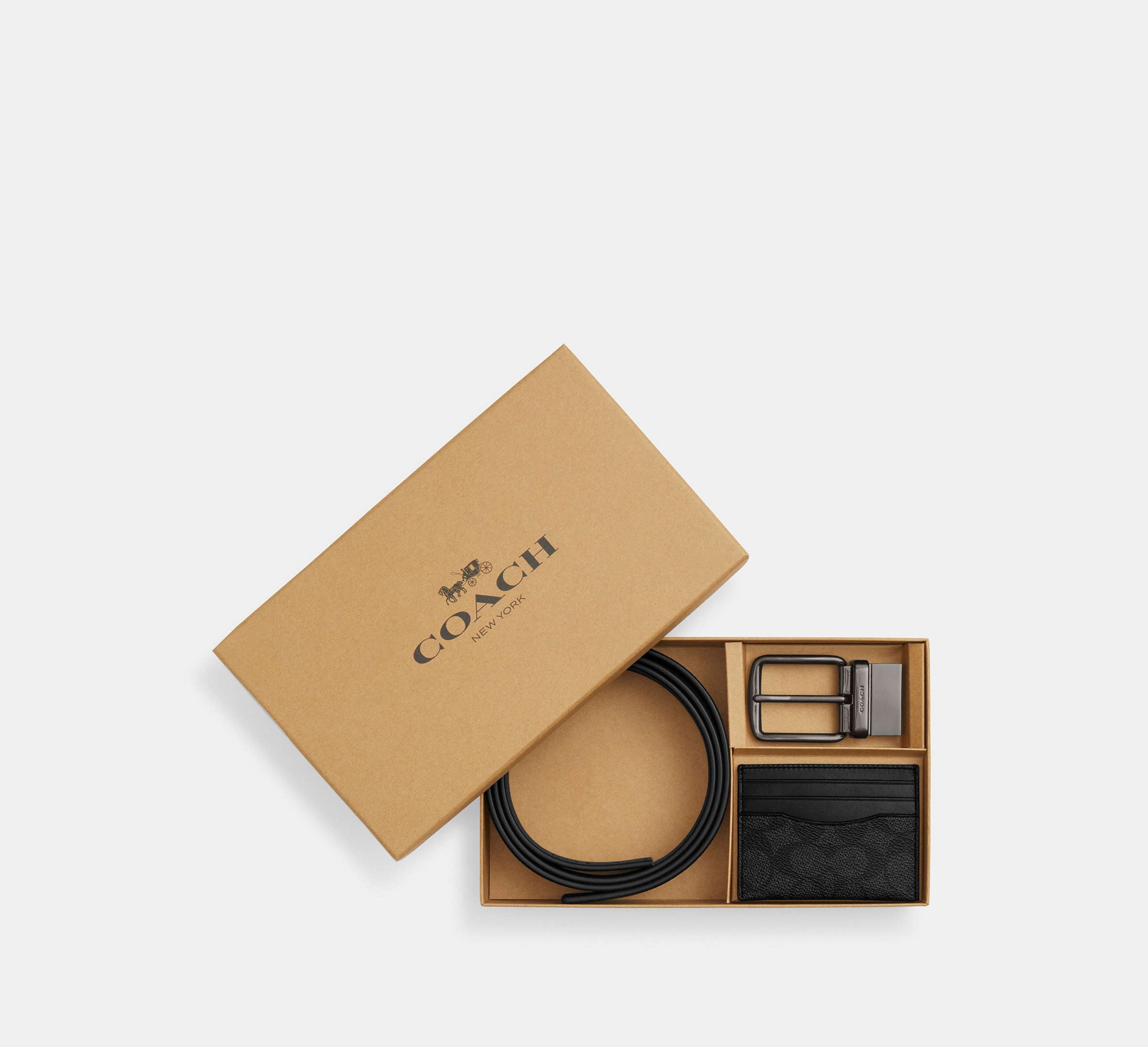 Coach Boxed Card Case And Belt Set In Signature Gunmetal/Charcoal/Black