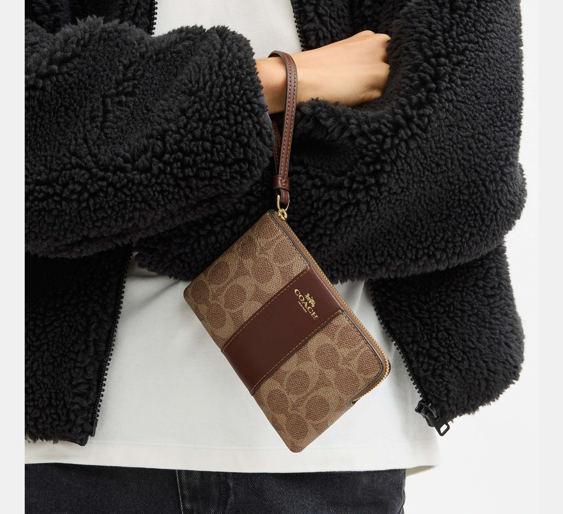 Coach Corner Zip Wristlet In Signature With Stripe - Gold/Tan/Brown