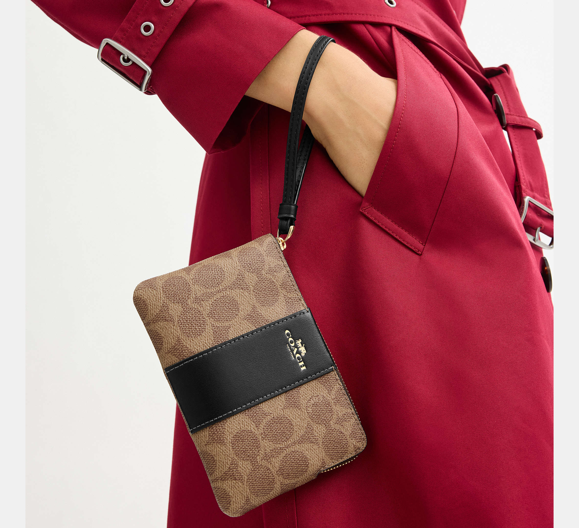 Coach Corner Zip Wristlet In Signature With Stripe - Gold/Tan/Black