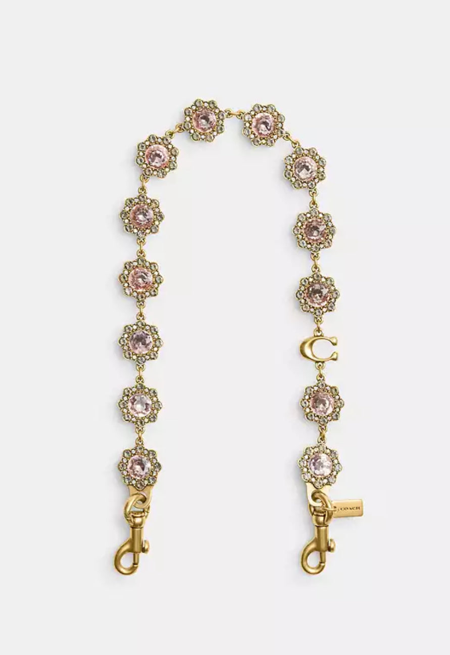 Işıltılı kristallerden oluşan çiçek motifleri ve Signature charm detayıyla zenginleştirilmiş, miras takılardan ilham alan bu kısa zincir askı; çantanıza anında şık ve gösterişli bir görünüm kazandırır. Değiştirilebilir tasarımı sayesinde iki adet kanca klipsi bulunur ve markanın en popüler çanta modellerine kolayca takılabilir.