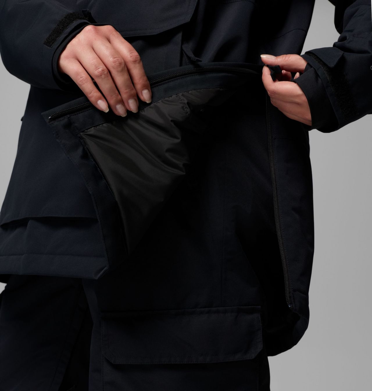 Geriye sabitlenebilir toz eteği, rüzgarı ve karı dışarıda tutar.