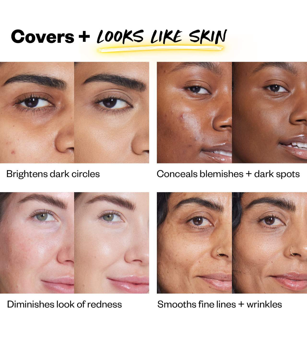 Bu silikon içermeyen formül, ciltle kolayca bütünleşerek doğal bir görünüm sağlar. Göz altı morluklarını, hiperpigmentasyonu, kızarıklığı ve sivilceleri azaltmaya yardımcı olur ancak yine de cilt gibi görünür.