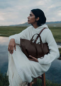 This sculptured compact tote bag featuring waves, folds, and curves can be used in two ways. Basket-style, with its sides open and straps on the outside, or As a flower-like closed bag, with its sides tucked in and its straps crossed on the inside.