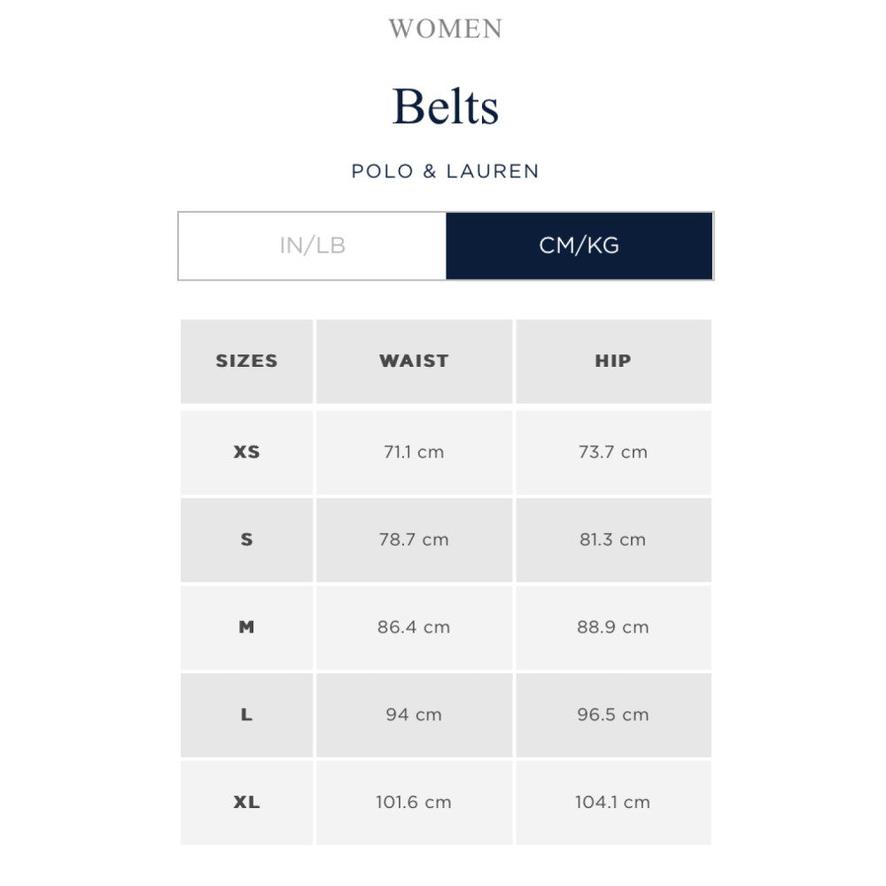 • XS beden 74 cm uzunluğunda; S beden 81 cm uzunluğunda; M beden 89 cm uzunluğunda; L beden 97 cm uzunluğunda; XL beden 104 cm uzunluğunda; 1X beden 112 cm uzunluğunda; 2X beden 119 cm uzunluğunda; 3X beden 127 cm uzunluğundadır. Kemer uzunluğu, geriye dönüş noktasından orta deliğe kadar ölçülür.