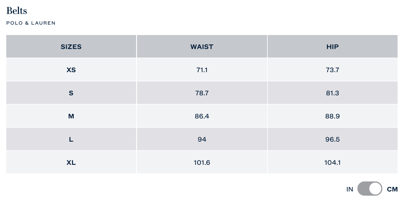 • XS beden 74 cm uzunluğunda; S beden 81 cm uzunluğunda; M beden 89 cm uzunluğunda; L beden 97 cm uzunluğunda; XL beden 104 cm uzunluğunda; 1X beden 112 cm uzunluğunda; 2X beden 119 cm uzunluğunda; 3X beden 127 cm uzunluğundadır. Kemer uzunluğu, geriye dönüş noktasından orta deliğe kadar ölçülür.