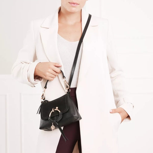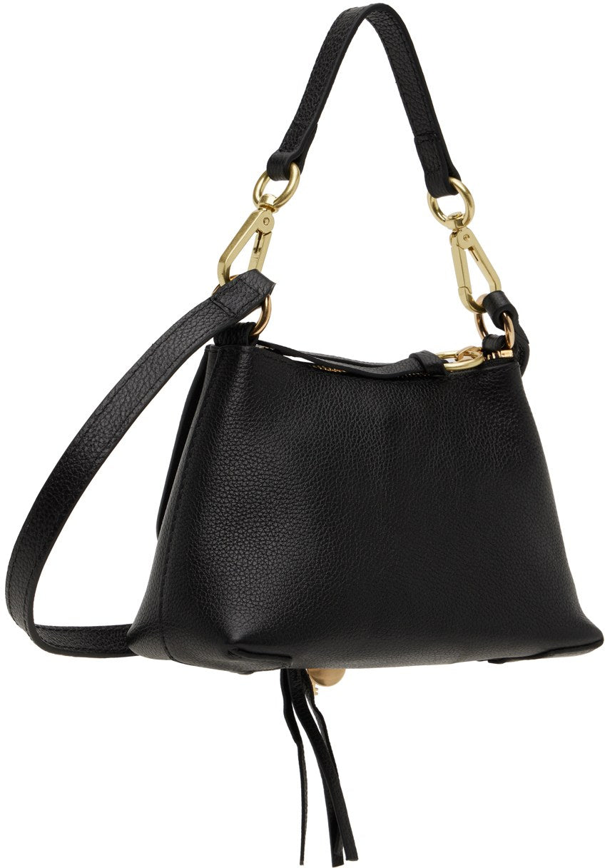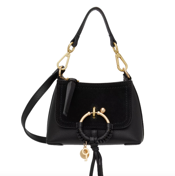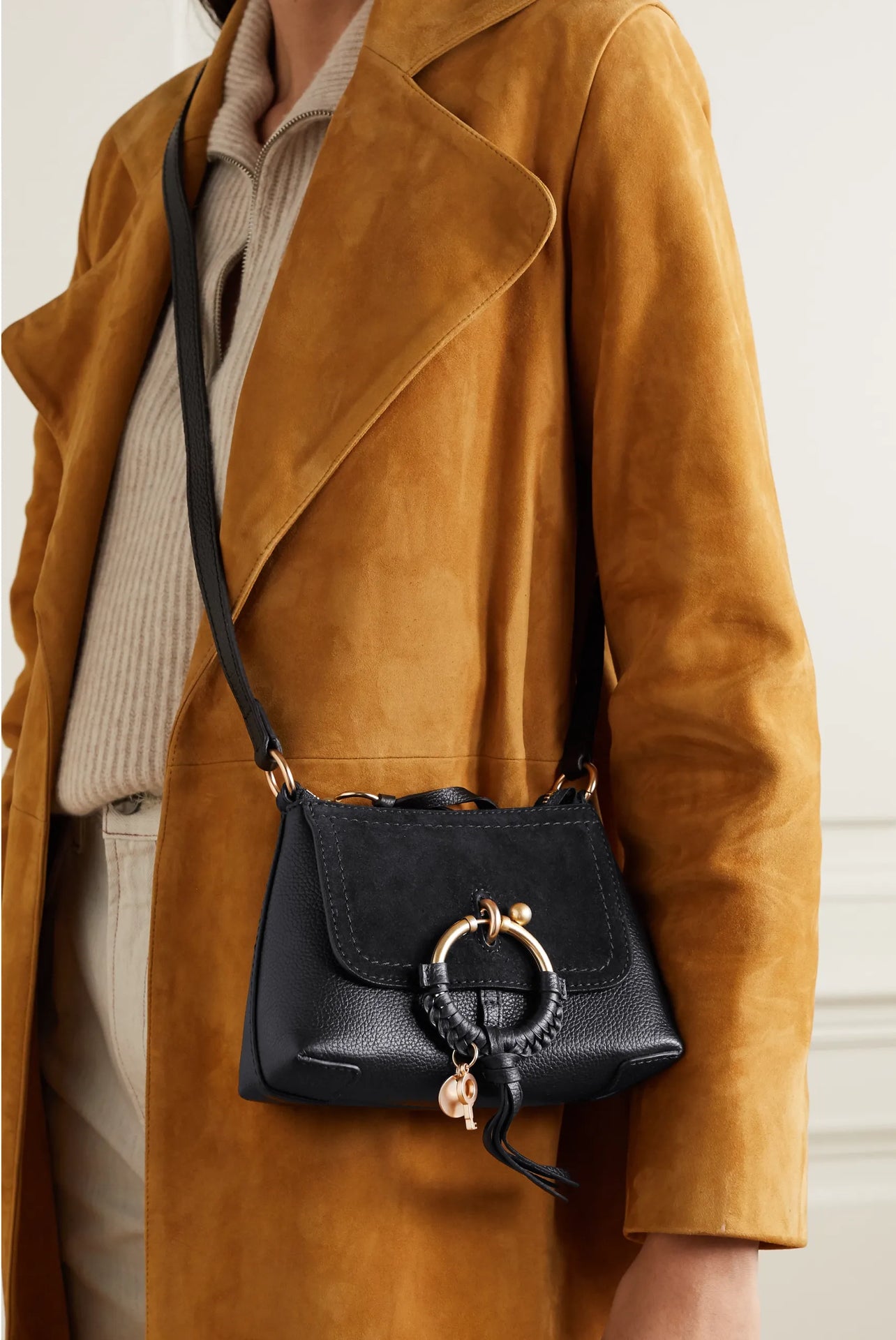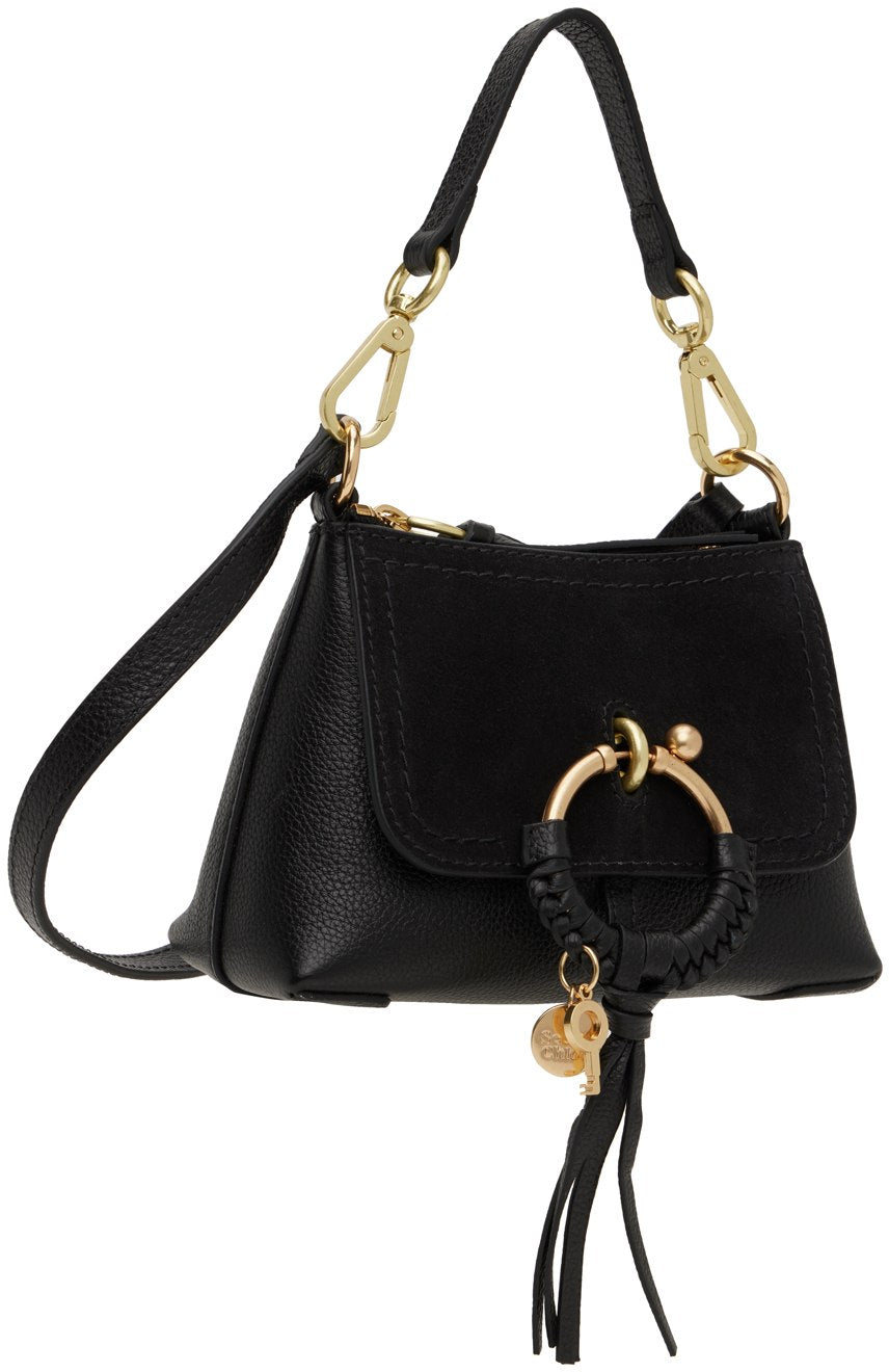 Paneled suede and grained leather shoulder bag in black. O-ring hardware with braided detailing, key charm, and logo disc at face.
