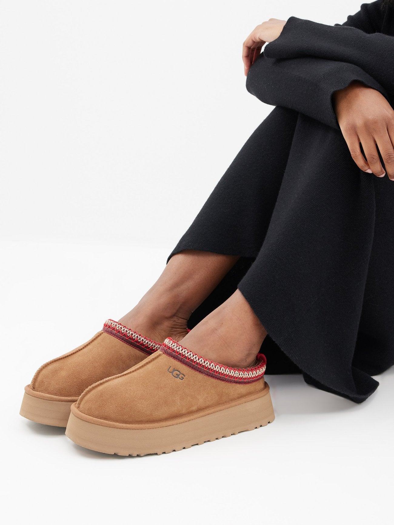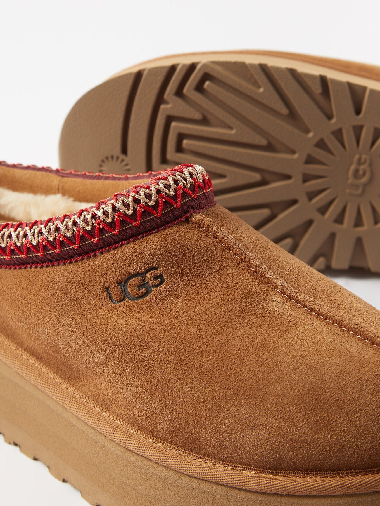 Featuring a fluffy collar, this essential house slipper is cast in soft suede and UGG’s signature sheepskin. Finished with a molded rubber sole, it pairs with our cozy robes or matching cashmere sets for maximal leisure. It has a polyester or textile binding made from 100% recycled polyester fibers.